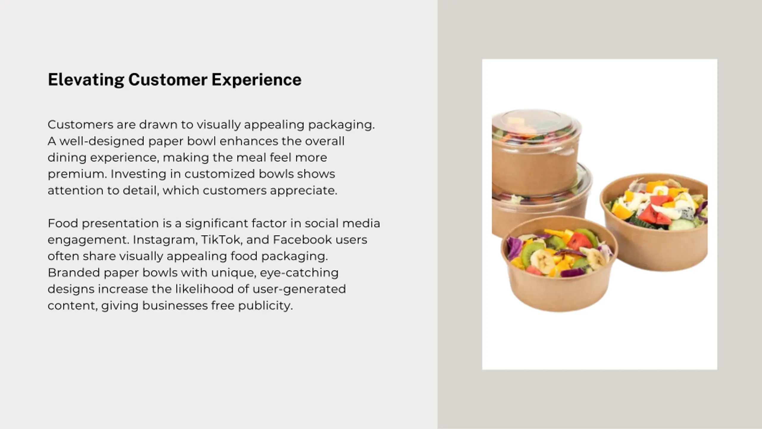 Elevating Customer Experience Customers are drawn to visually appealing packaging. A well-designed paper bowl enhances the overall dining experience, making the meal feel more premium. Investing in customized bowls shows attention to detail, which customers appreciate. Food presentation is a significant factor in social media engagement. Instagram, TikTok, and Facebook users often share visually appealing food packaging. Branded paper bowls with unique, eye-catching designs increase the likelihood of user-generated content, giving businesses free publicity.