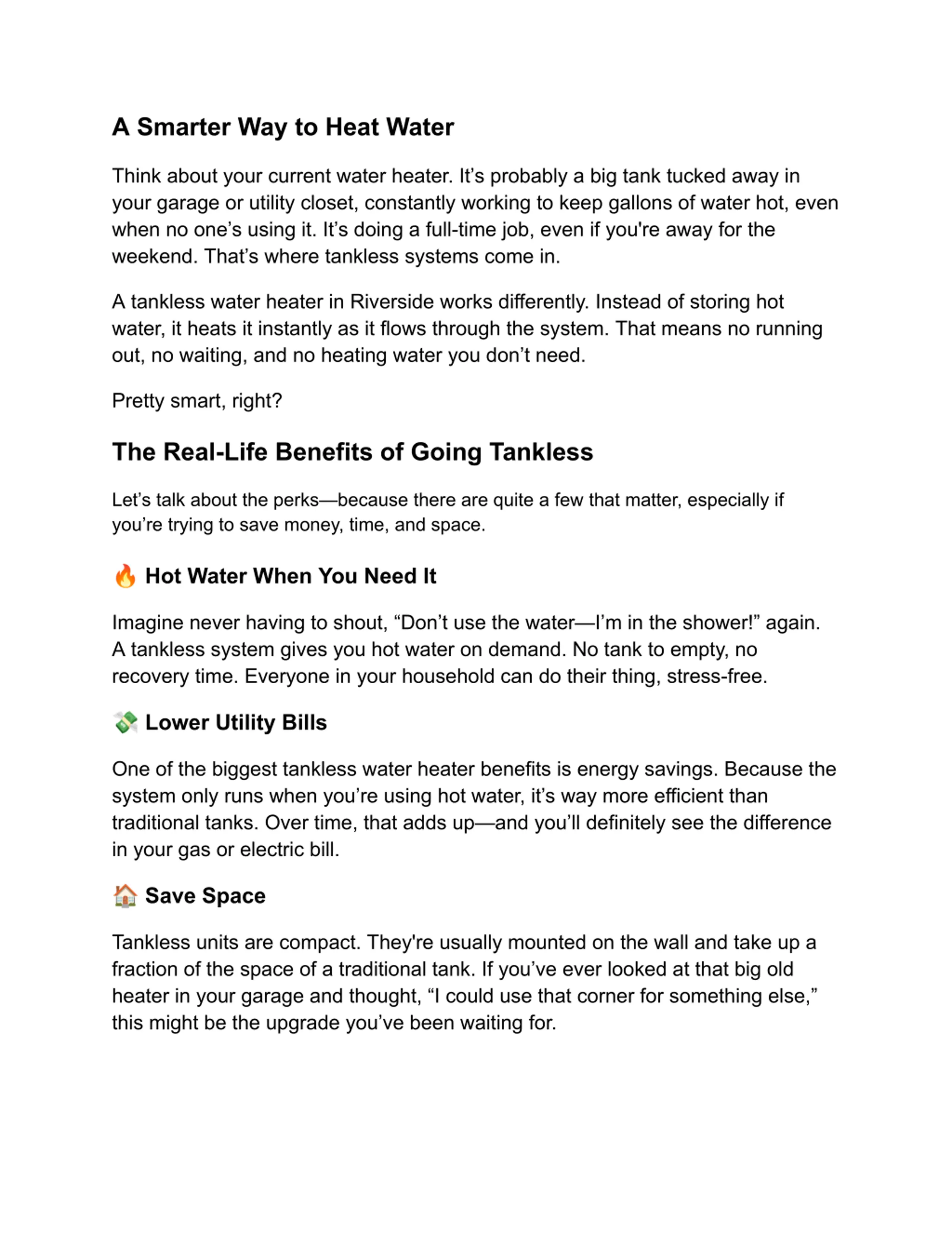 A Smarter Way to Heat Water Think about your current water heater. It s probably a big tank tucked away in your garage or utility closet, constantly working to keep gallons of water hot, even when no one s using it. It s doing a full-time job, even if you're away for the weekend. That s where tankless systems come in. A tankless water heater in Riverside works differently. Instead of storing hot water, it heats it instantly as it flows through the system. That means no running out, no waiting, and no heating water you don t need. Pretty smart, right? The Real-Life Benefits of Going Tankless Let s talk about the perks because there are quite a few that matter, especially if you re trying to save money, time, and space. ? Hot Water When You Need It Imagine never having to shout, Don t use the water I m in the shower! again. A tankless system gives you hot water on demand. No tank to empty, no recovery time. Everyone in your household can do their thing, stress-free. ? Lower Utility Bills One of the biggest tankless water heater benefits is energy savings. Because the system only runs when you re using hot water, it s way more efficient than traditional tanks. Over time, that adds up and you ll definitely see the difference in your gas or electric bill. ? Save Space Tankless units are compact. They're usually mounted on the wall and take up a fraction of the space of a traditional tank. If you ve ever looked at that big old heater in your garage and thought, I could use that corner for something else, this might be the upgrade you ve been waiting for.