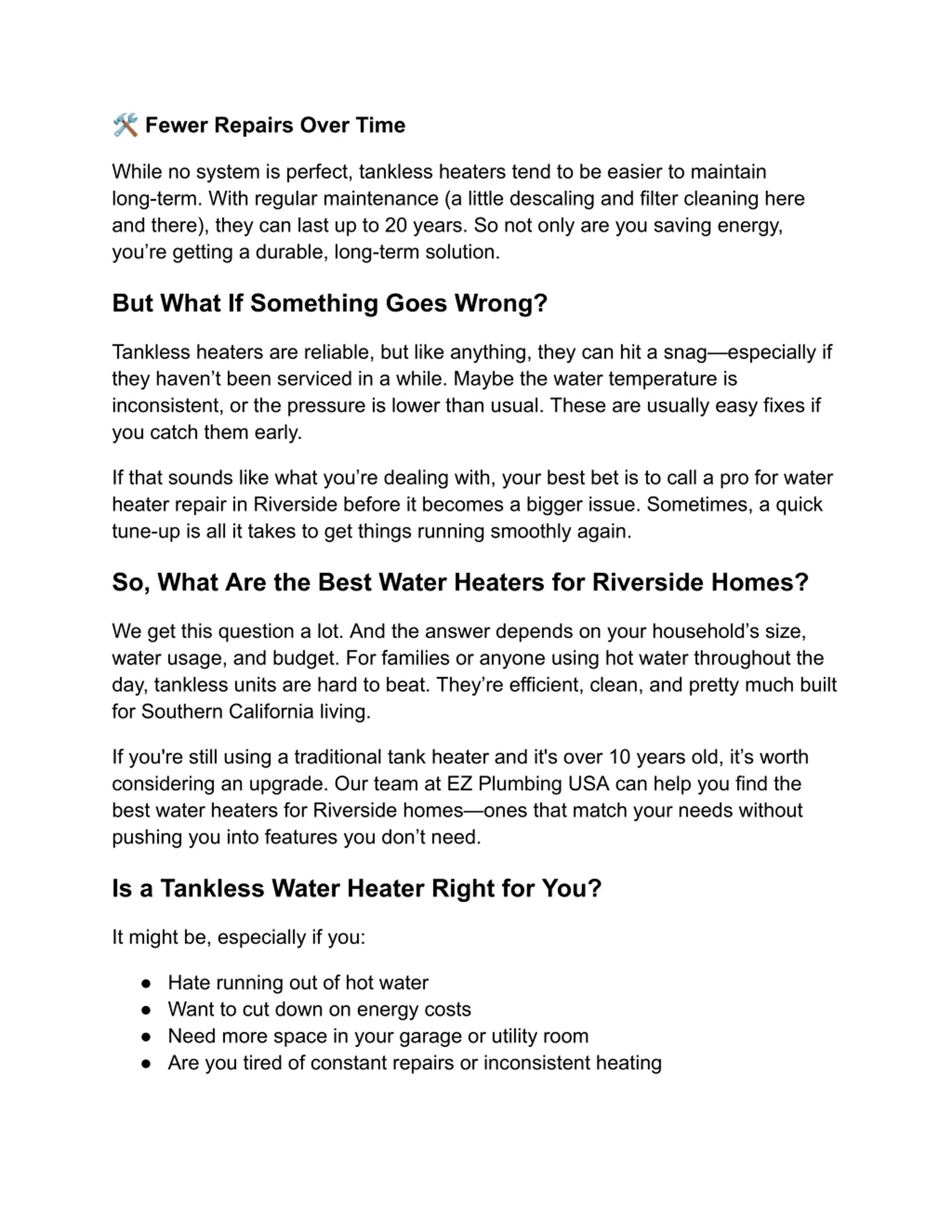 ? Fewer Repairs Over Time While no system is perfect, tankless heaters tend to be easier to maintain long-term. With regular maintenance (a little descaling and filter cleaning here and there), they can last up to 20 years. So not only are you saving energy, you re getting a durable, long-term solution. But What If Something Goes Wrong? Tankless heaters are reliable, but like anything, they can hit a snag especially if they haven t been serviced in a while. Maybe the water temperature is inconsistent, or the pressure is lower than usual. These are usually easy fixes if you catch them early. If that sounds like what you re dealing with, your best bet is to call a pro for water heater repair in Riverside before it becomes a bigger issue. Sometimes, a quick tune-up is all it takes to get things running smoothly again. So, What Are the Best Water Heaters for Riverside Homes? We get this question a lot. And the answer depends on your household s size, water usage, and budget. For families or anyone using hot water throughout the day, tankless units are hard to beat. They re efficient, clean, and pretty much built for Southern California living. If you're still using a traditional tank heater and it's over 10 years old, it s worth considering an upgrade. Our team at EZ Plumbing USA can help you find the best water heaters for Riverside homes ones that match your needs without pushing you into features you don t need. Is a Tankless Water Heater Right for You? It might be, especially if you: Hate running out of hot water Want to cut down on energy costs Need more space in your garage or utility room Are you tired of constant repairs or inconsistent heating