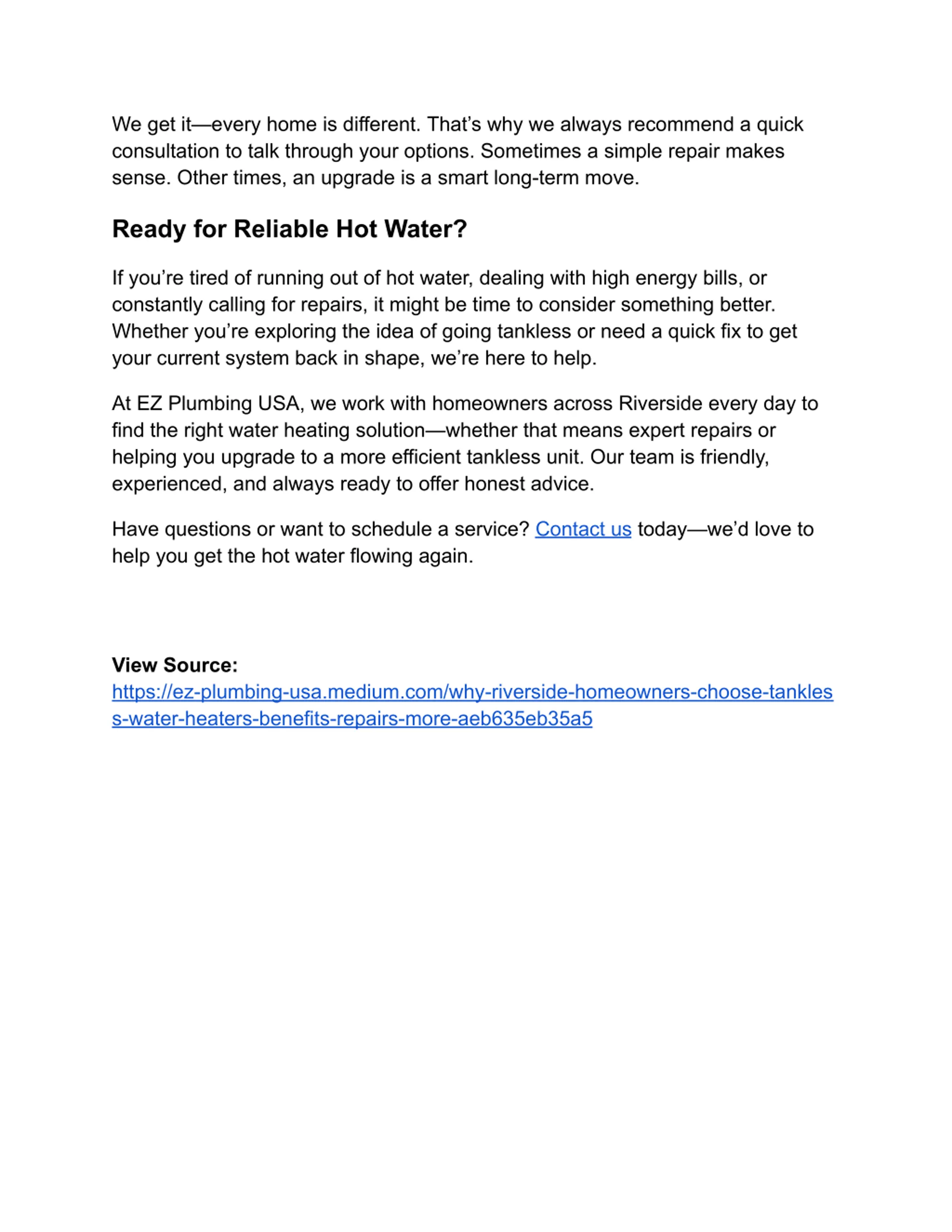 We get itevery home is different. Thats why we always recommend a quick consultation to talk through your options. Sometimes a simple repair makes sense. Other times, an upgrade is a smart long-term move. Ready for Reliable Hot Water? If you re tired of running out of hot water, dealing with high energy bills, or constantly calling for repairs, it might be time to consider something better. Whether you re exploring the idea of going tankless or need a quick fix to get your current system back in shape, we re here to help. At EZ Plumbing USA, we work with homeowners across Riverside every day to find the right water heating solution whether that means expert repairs or helping you upgrade to a more efficient tankless unit. Our team is friendly, experienced, and always ready to offer honest advice. Have questions or want to schedule a service? Contact us today we d love to help you get the hot water flowing again. View Source: https://ez-plumbing-usa.medium.com/why-riverside-homeowners-choose-tankles s-water-heaters-benefits-repairs-more-aeb635eb35a5