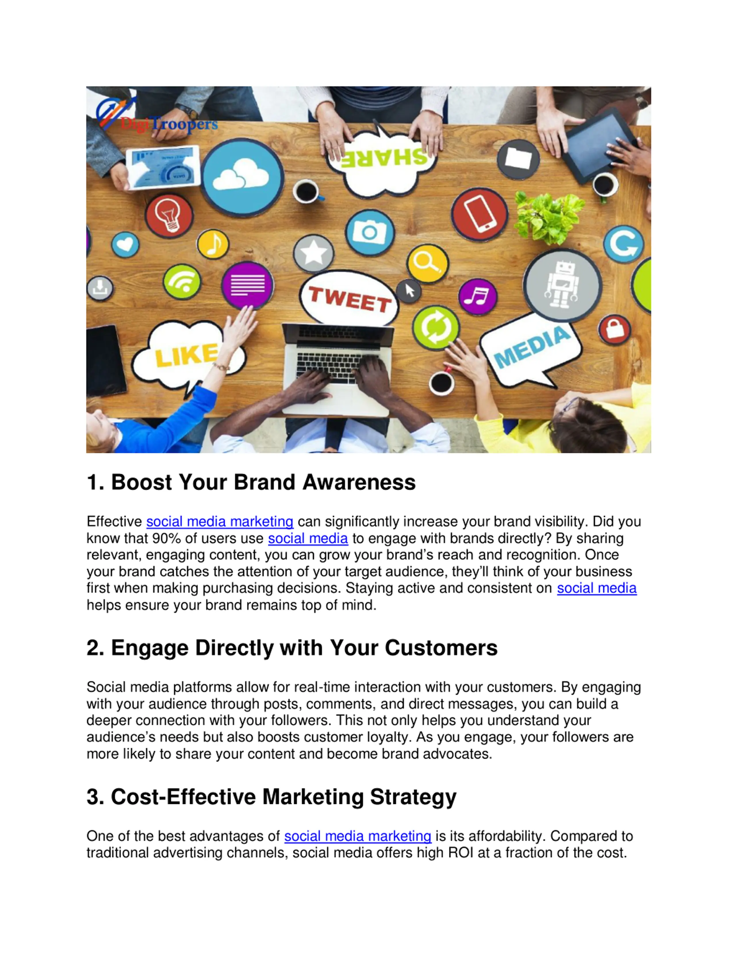 1. Boost Your Brand Awareness Effective social media marketing can significantly increase your brand visibility. Did you know that 90% of users use social media to engage with brands directly? By sharing relevant, engaging content, you can grow your brand s reach and recognition. Once your brand catches the attention of your target audience, they ll think of your business first when making purchasing decisions. Staying active and consistent on social media helps ensure your brand remains top of mind. 2. Engage Directly with Your Customers Social media platforms allow for real-time interaction with your customers. By engaging with your audience through posts, comments, and direct messages, you can build a deeper connection with your followers. This not only helps you understand your audience s needs but also boosts customer loyalty. As you engage, your followers are more likely to share your content and become brand advocates. 3. Cost-Effective Marketing Strategy One of the best advantages of social media marketing is its affordability. Compared to traditional advertising channels, social media offers high ROI at a fraction of the cost.