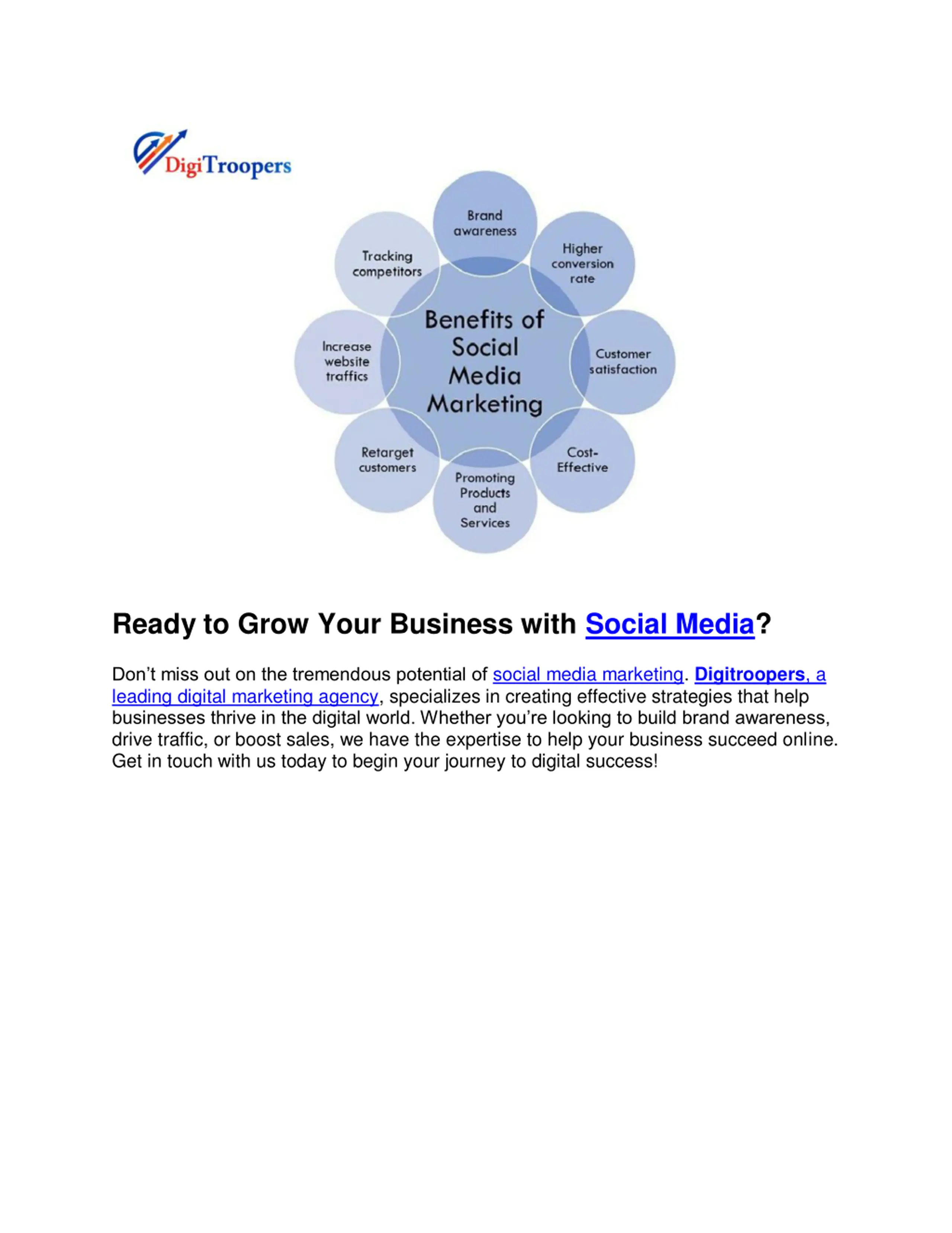 Ready to Grow Your Business with Social Media? Don t miss out on the tremendous potential of social media marketing. Digitroopers, a leading digital marketing agency, specializes in creating effective strategies that help businesses thrive in the digital world. Whether you re looking to build brand awareness, drive traffic, or boost sales, we have the expertise to help your business succeed online. Get in touch with us today to begin your journey to digital success!