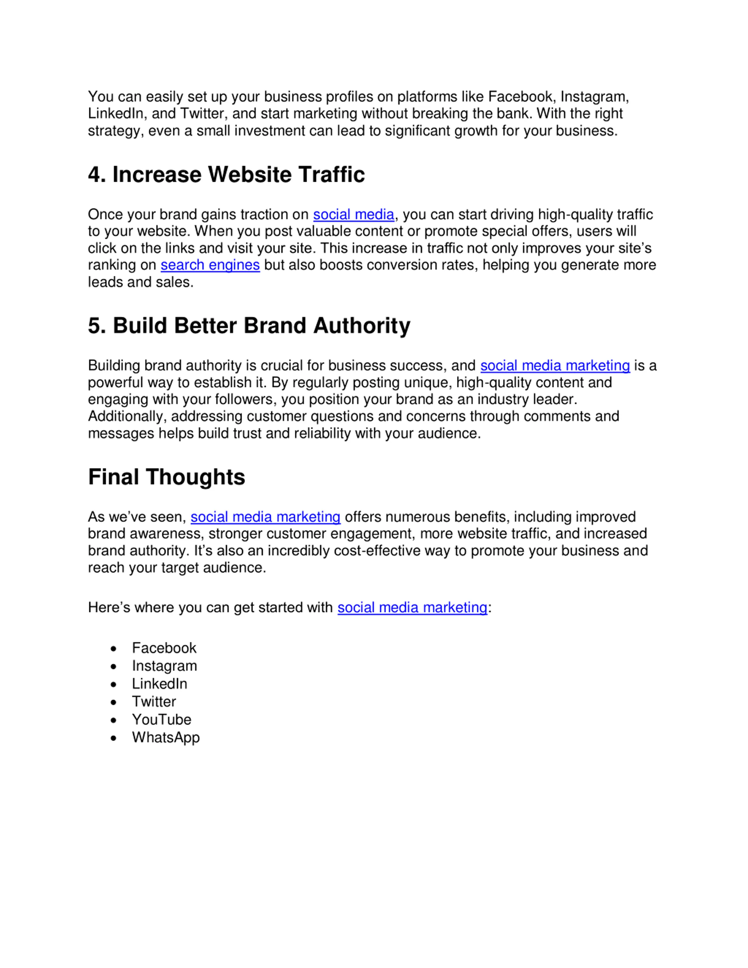 You can easily set up your business profiles on platforms like Facebook, Instagram, LinkedIn, and Twitter, and start marketing without breaking the bank. With the right strategy, even a small investment can lead to significant growth for your business. 4. Increase Website Traffic Once your brand gains traction on social media, you can start driving high-quality traffic to your website. When you post valuable content or promote special offers, users will click on the links and visit your site. This increase in traffic not only improves your site s ranking on search engines but also boosts conversion rates, helping you generate more leads and sales. 5. Build Better Brand Authority Building brand authority is crucial for business success, and social media marketing is a powerful way to establish it. By regularly posting unique, high-quality content and engaging with your followers, you position your brand as an industry leader. Additionally, addressing customer questions and concerns through comments and messages helps build trust and reliability with your audience. Final Thoughts As we ve seen, social media marketing offers numerous benefits, including improved brand awareness, stronger customer engagement, more website traffic, and increased brand authority. It s also an incredibly cost-effective way to promote your business and reach your target audience. Here s where you can get started with social media marketing: Facebook Instagram LinkedIn Twitter YouTube WhatsApp