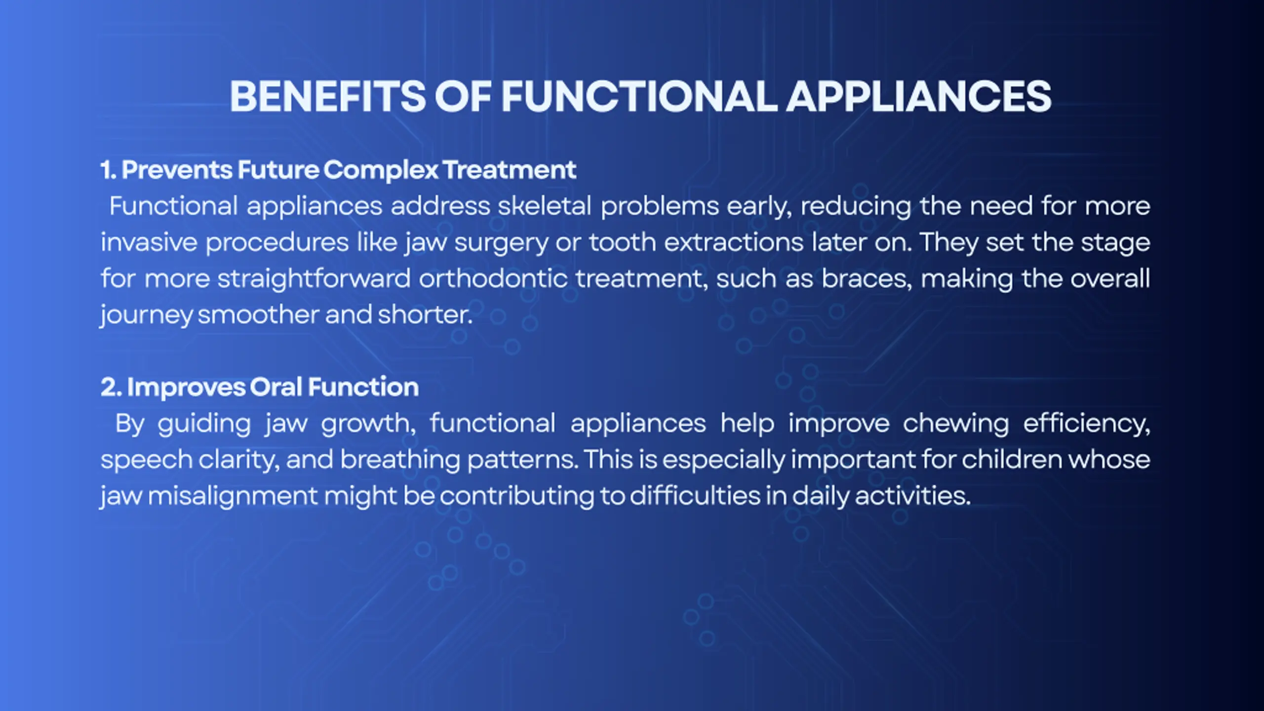 BENEFITS OF FUNCTIONAL APPLIANCES 1. Prevents Future Complex Treatment Functional appliances address skeletal problems early, reducing the need for more invasive procedures like jaw surgery or tooth extractions later on. They set the stage for more straightforward orthodontic treatment, such as braces, making the overall journey smoother and shorter. 2. Improves Oral Function By guiding jaw growth, functional appliances help improve chewing efficiency, speech clarity, and breathing patterns. This is especially important for children whose jaw misalignment might be contributing to difficulties in daily activities.
