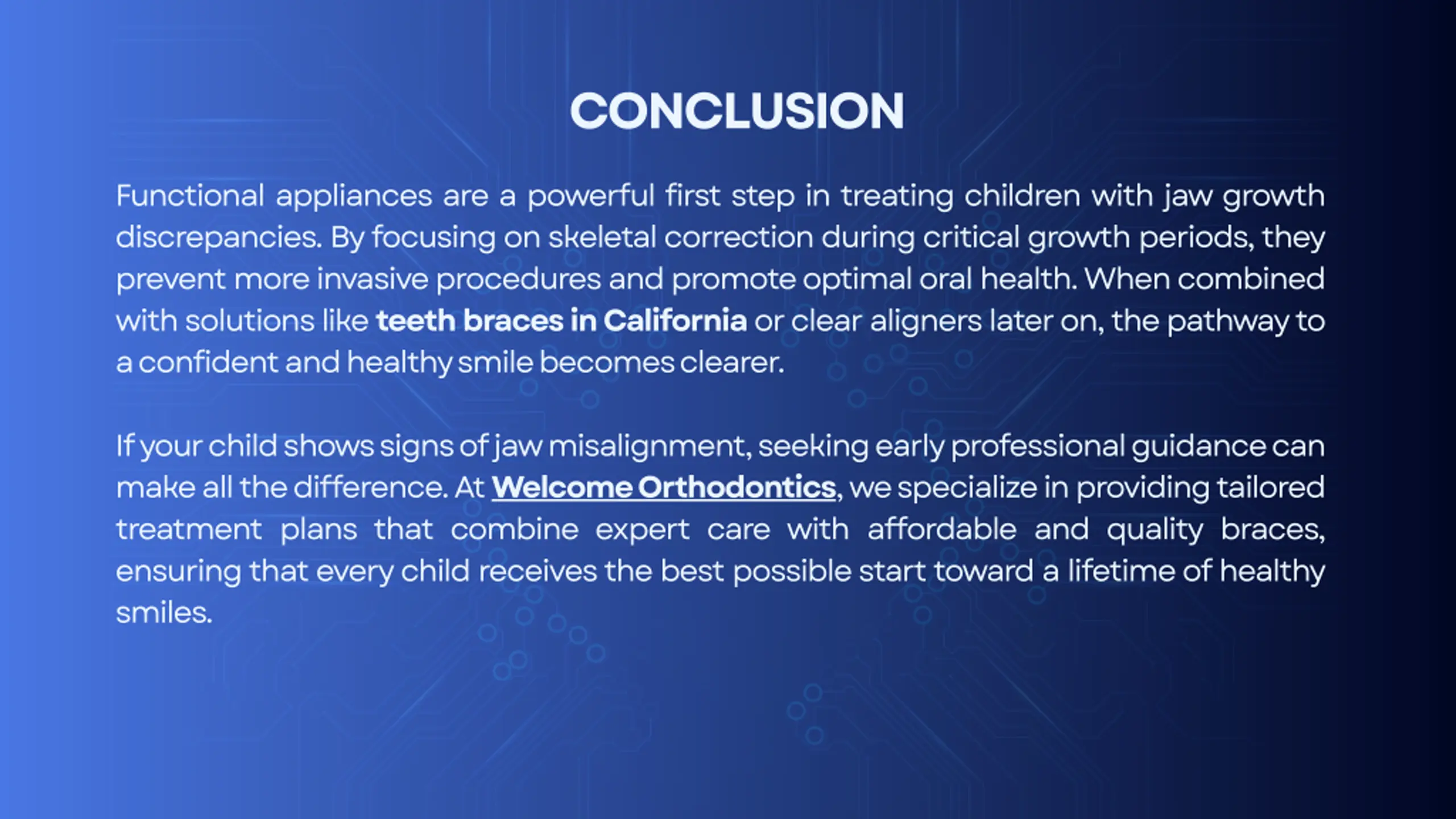 CONCLUSION Functional appliances are a powerful first step in treating children with jaw growth discrepancies. By focusing on skeletal correction during critical growth periods, they prevent more invasive procedures and promote optimal oral health. When combined with solutions like teeth braces in California or clear aligners later on, the pathway to a confident and healthy smile becomes clearer. If your child shows signs of jaw misalignment, seeking early professional guidance can make all the difference. At Welcome Orthodontics, we specialize in providing tailored treatment plans that combine expert care with affordable and quality braces, ensuring that every child receives the best possible start toward a lifetime of healthy smiles.