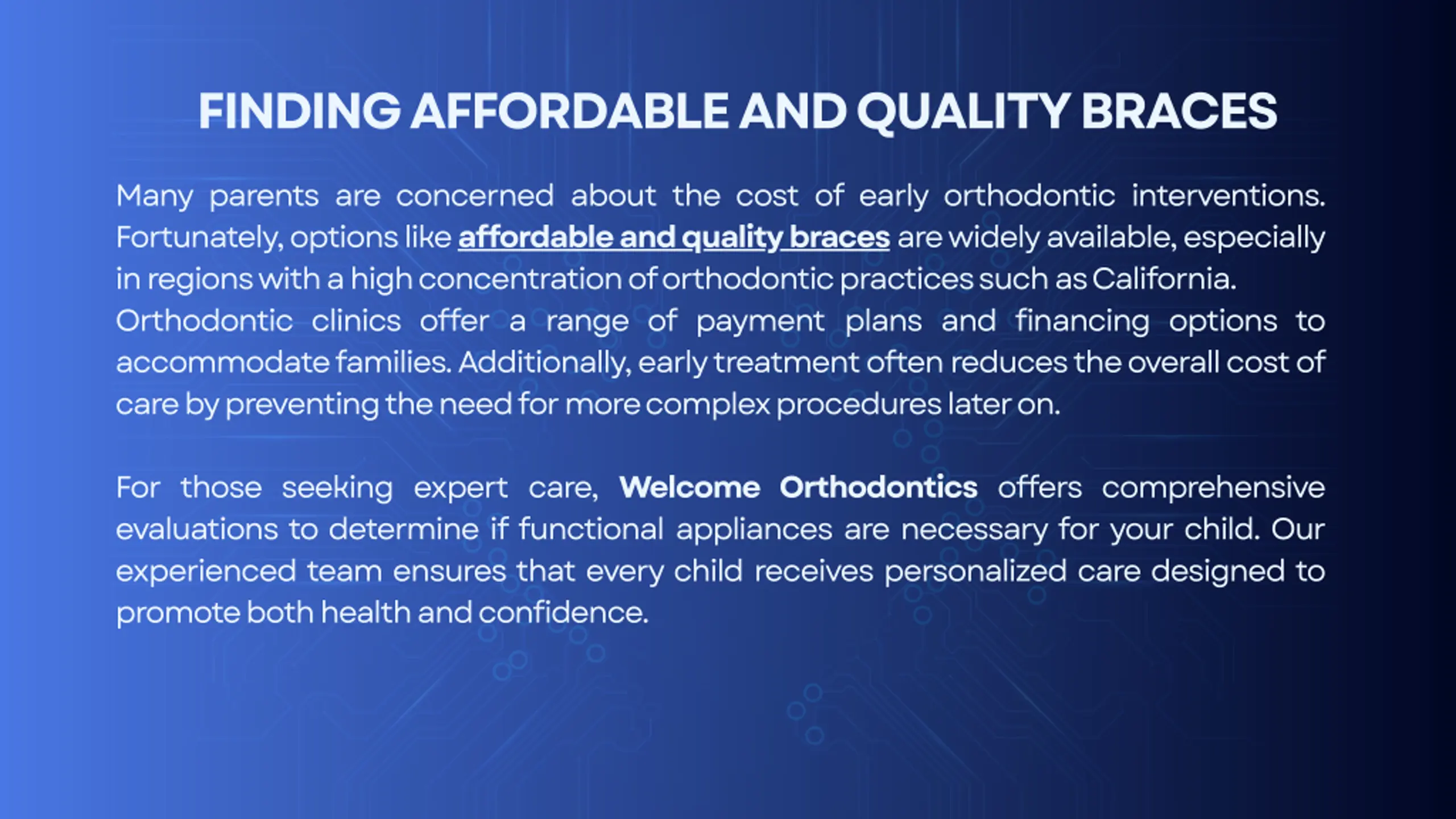 FINDING AFFORDABLE AND QUALITY BRACES Many parents are concerned about the cost of early orthodontic interventions. Fortunately, options like affordable and quality braces are widely available, especially in regions with a high concentration of orthodontic practices such as California. Orthodontic clinics offer a range of payment plans and financing options to accommodate families. Additionally, early treatment often reduces the overall cost of care by preventing the need for more complex procedures later on. For those seeking expert care, Welcome Orthodontics offers comprehensive evaluations to determine if functional appliances are necessary for your child. Our experienced team ensures that every child receives personalized care designed to promote both health and confidence.