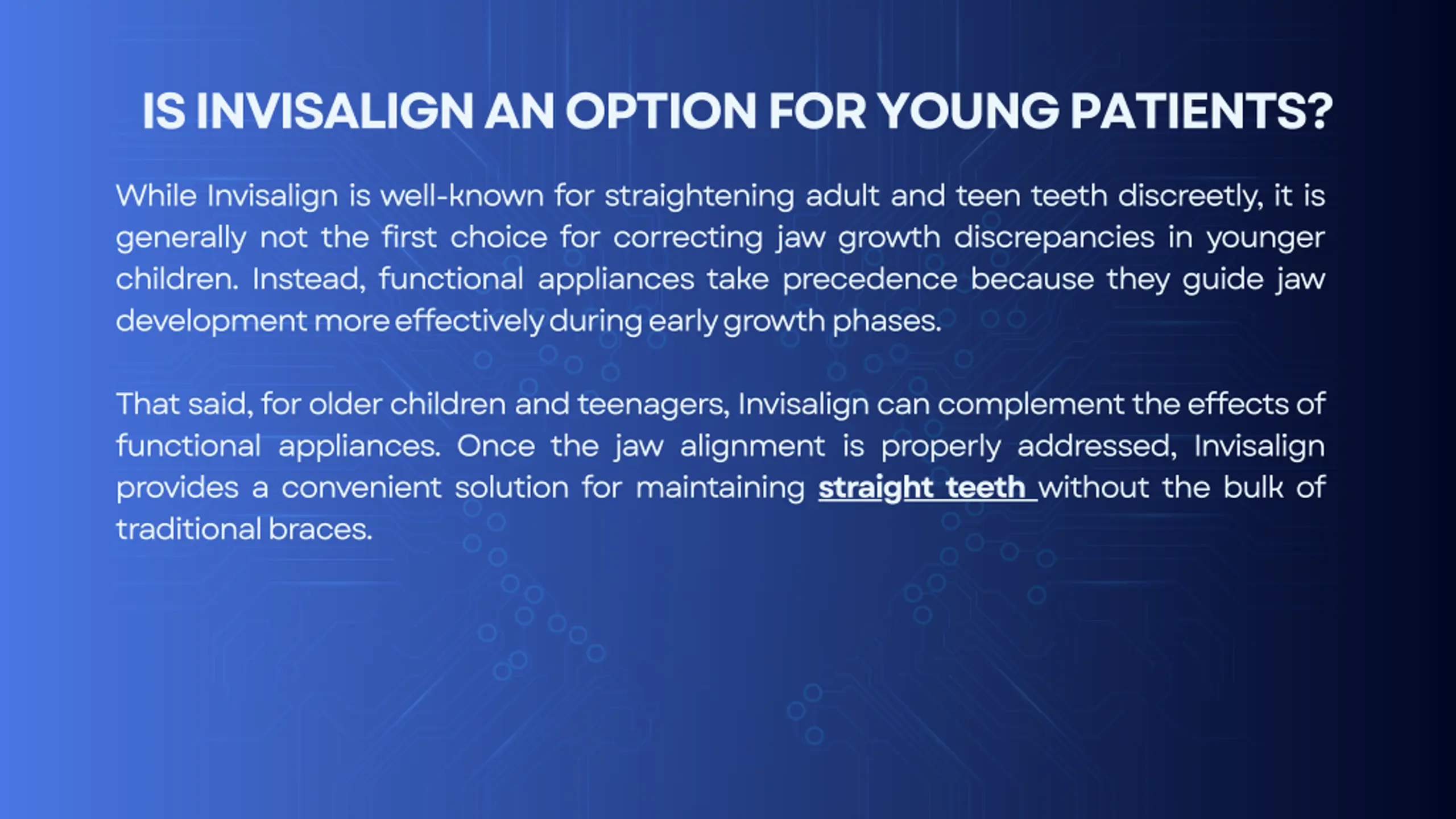 IS INVISALIGN AN OPTION FOR YOUNG PATIENTS? While Invisalign is well-known for straightening adult and teen teeth discreetly, it is generally not the first choice for correcting jaw growth discrepancies in younger children. Instead, functional appliances take precedence because they guide jaw development more effectively during early growth phases. That said, for older children and teenagers, Invisalign can complement the effects of functional appliances. Once the jaw alignment is properly addressed, Invisalign provides a convenient solution for maintaining straight teeth without the bulk of traditional braces.