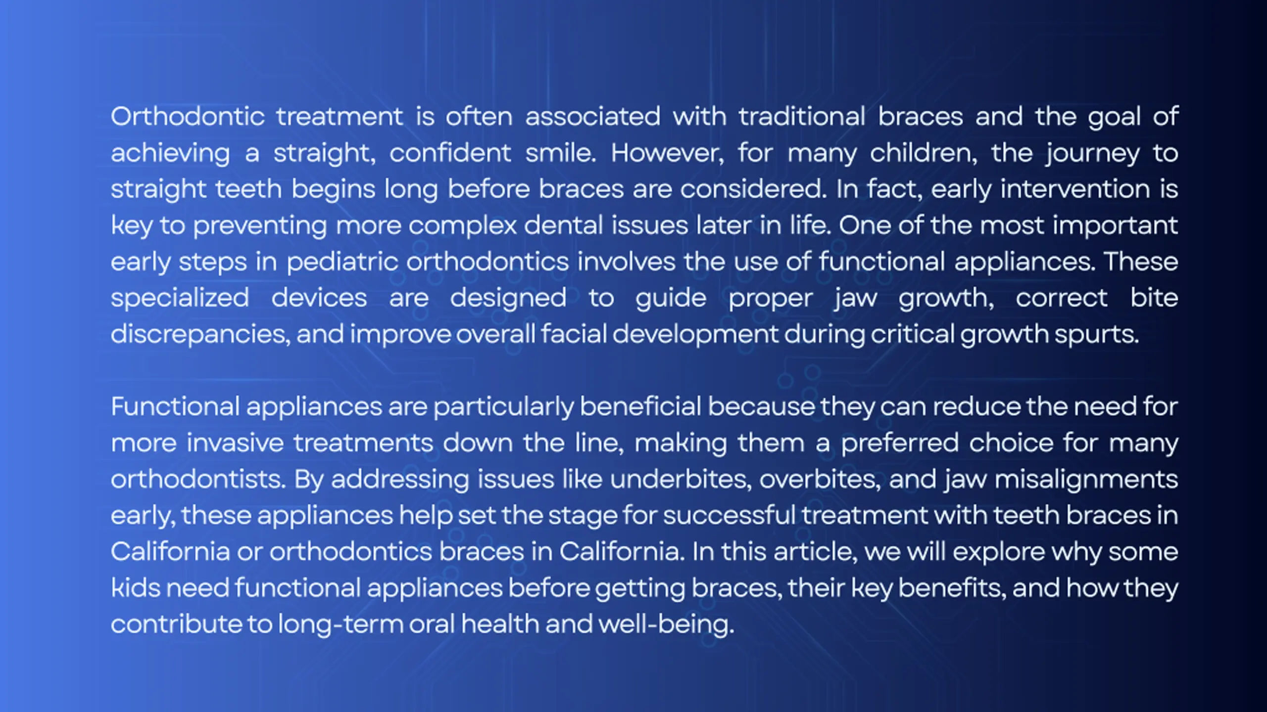 Orthodontic treatment is often associated with traditional braces and the goal of achieving a straight, confident smile. However, for many children, the journey to straight teeth begins long before braces are considered. In fact, early intervention is key to preventing more complex dental issues later in life. One of the most important early steps in pediatric orthodontics involves the use of functional appliances. These specialized devices are designed to guide proper jaw growth, correct bite discrepancies, and improve overall facial development during critical growth spurts. Functional appliances are particularly beneficial because they can reduce the need for more invasive treatments down the line, making them a preferred choice for many orthodontists. By addressing issues like underbites, overbites, and jaw misalignments early, these appliances help set the stage for successful treatment with teeth braces in California or orthodontics braces in California. In this article, we will explore why some kids need functional appliances before getting braces, their key benefits, and how they contribute to long-term oral health and well-being.