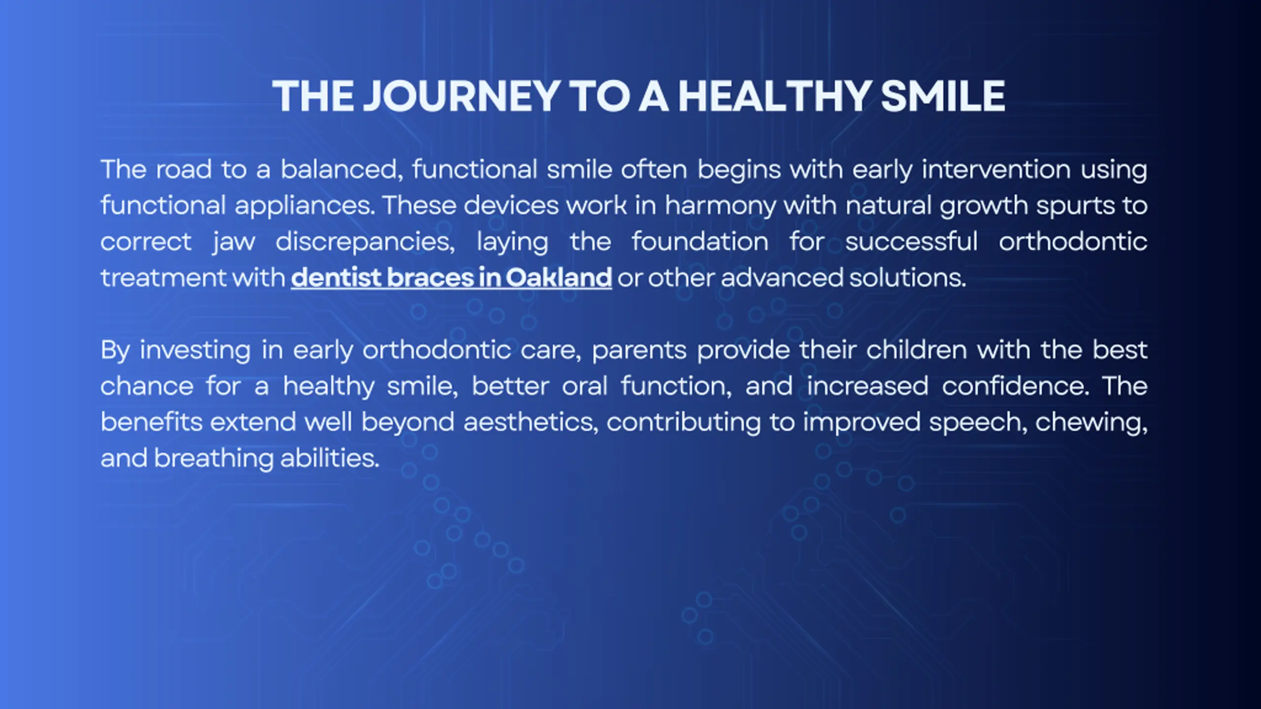 THE JOURNEY TO A HEALTHY SMILE The road to a balanced, functional smile often begins with early intervention using functional appliances. These devices work in harmony with natural growth spurts to correct jaw discrepancies, laying the foundation for successful orthodontic treatment with dentist braces in Oakland or other advanced solutions. By investing in early orthodontic care, parents provide their children with the best chance for a healthy smile, better oral function, and increased confidence. The benefits extend well beyond aesthetics, contributing to improved speech, chewing, and breathing abilities.