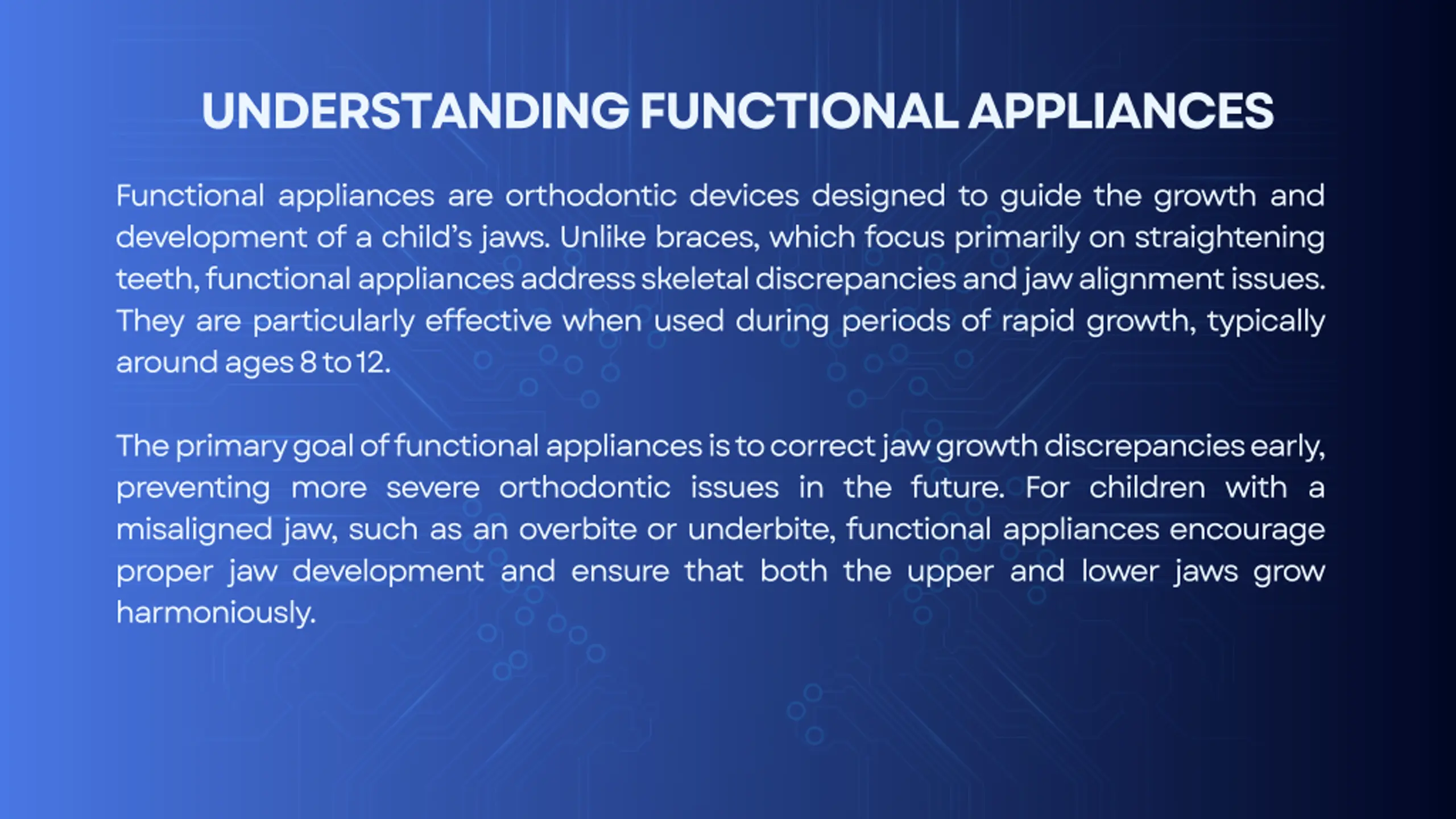 UNDERSTANDING FUNCTIONAL APPLIANCES Functional appliances are orthodontic devices designed to guide the growth and development of a child s jaws. Unlike braces, which focus primarily on straightening teeth, functional appliances address skeletal discrepancies and jaw alignment issues. They are particularly effective when used during periods of rapid growth, typically around ages 8 to 12. The primary goal of functional appliances is to correct jaw growth discrepancies early, preventing more severe orthodontic issues in the future. For children with a misaligned jaw, such as an overbite or underbite, functional appliances encourage proper jaw development and ensure that both the upper and lower jaws grow harmoniously.