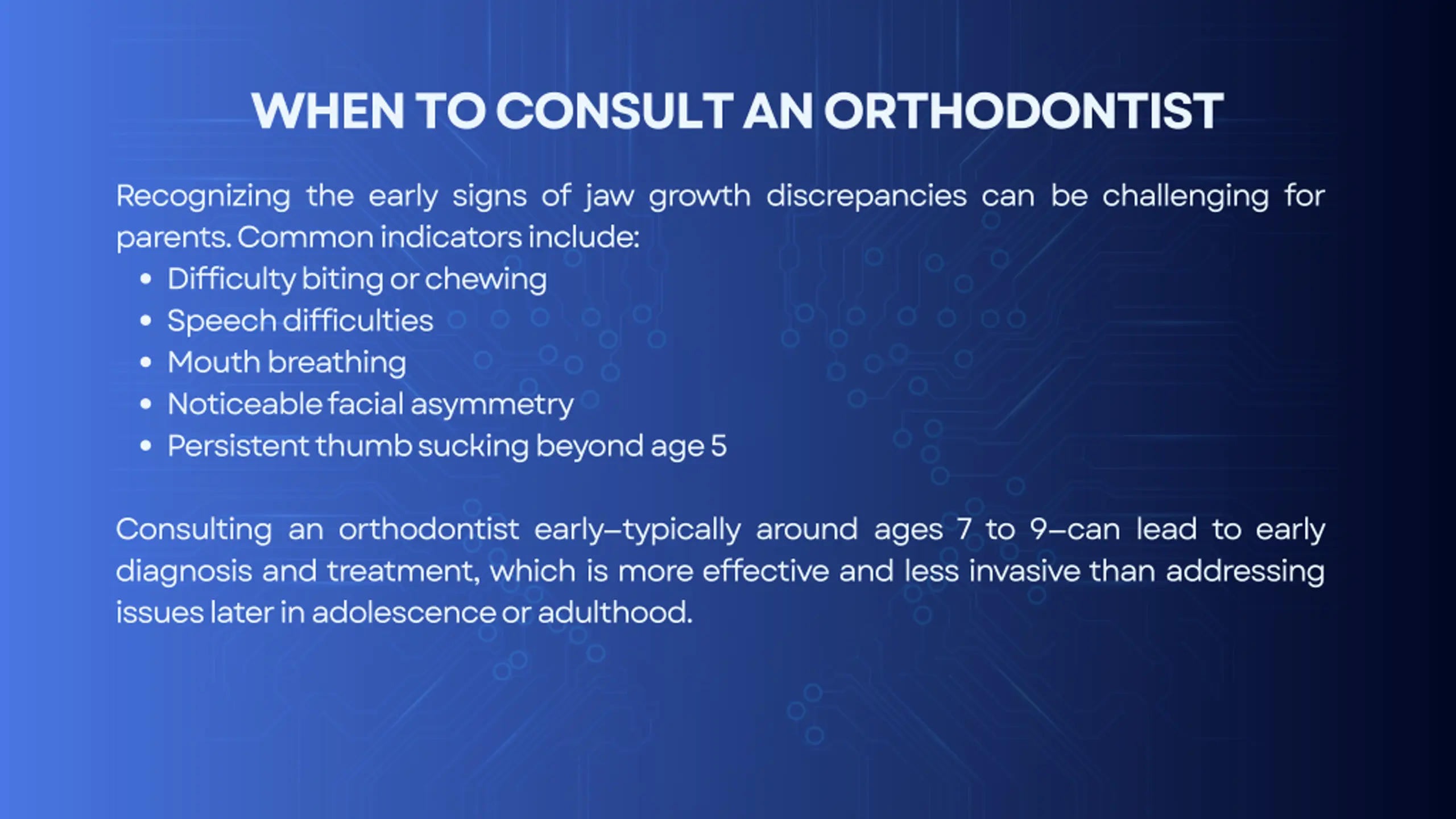 WHEN TO CONSULT AN ORTHODONTIST Recognizing the early signs of jaw growth discrepancies can be challenging for parents. Common indicators include: Difficulty biting or chewing Speech difficulties Mouth breathing Noticeable facial asymmetry Persistent thumb sucking beyond age 5 Consulting an orthodontist early typically around ages 7 to 9 can lead to early diagnosis and treatment, which is more effective and less invasive than addressing issues later in adolescence or adulthood.