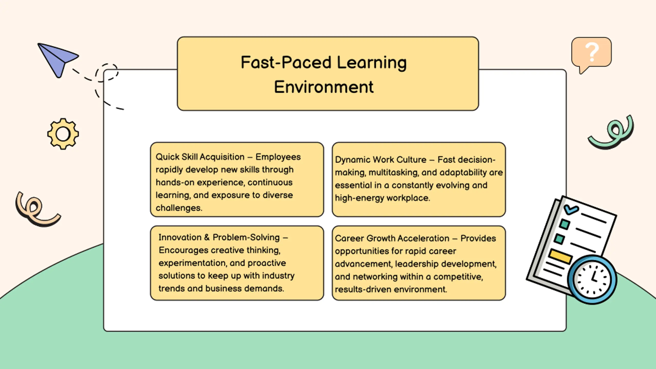 Fast-Paced Learning Environment Quick Skill Acquisition Employees rapidly develop new skills through hands-on experience, continuous learning, and exposure to diverse challenges. Dynamic Work Culture Fast decision- making, multitasking, and adaptability are essential in a constantly evolving and high-energy workplace. Innovation & Problem-Solving Encourages creative thinking, experimentation, and proactive solutions to keep up with industry trends and business demands. Career Growth Acceleration Provides opportunities for rapid career advancement, leadership development, and networking within a competitive, results-driven environment.