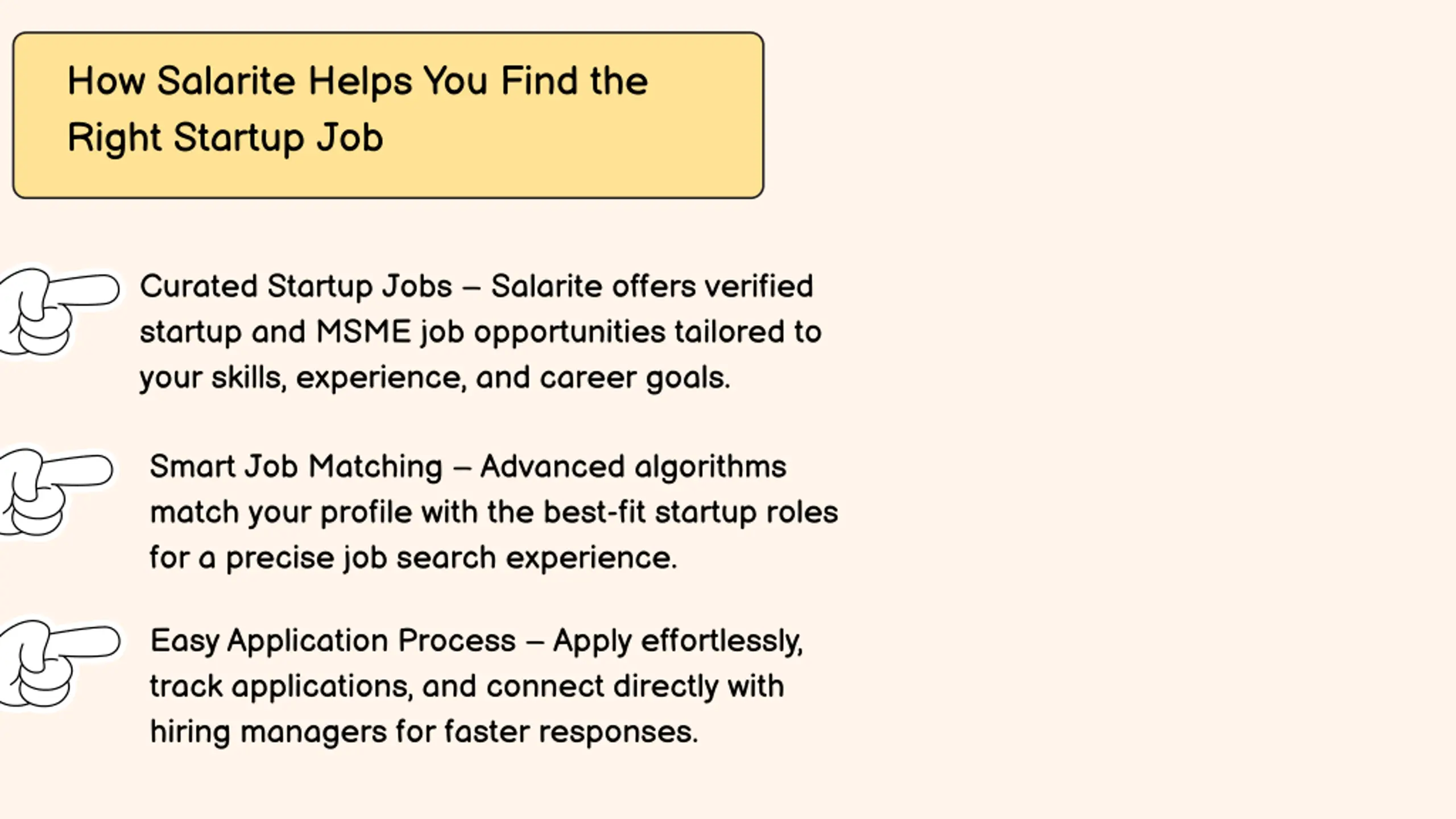 How Salarite Helps You Find the Right Startup Job Curated Startup Jobs Salarite offers verified startup and MSME job opportunities tailored to your skills, experience, and career goals. Smart Job Matching Advanced algorithms match your profile with the best-fit startup roles for a precise job search experience. Easy Application Process Apply effortlessly, track applications, and connect directly with hiring managers for faster responses.