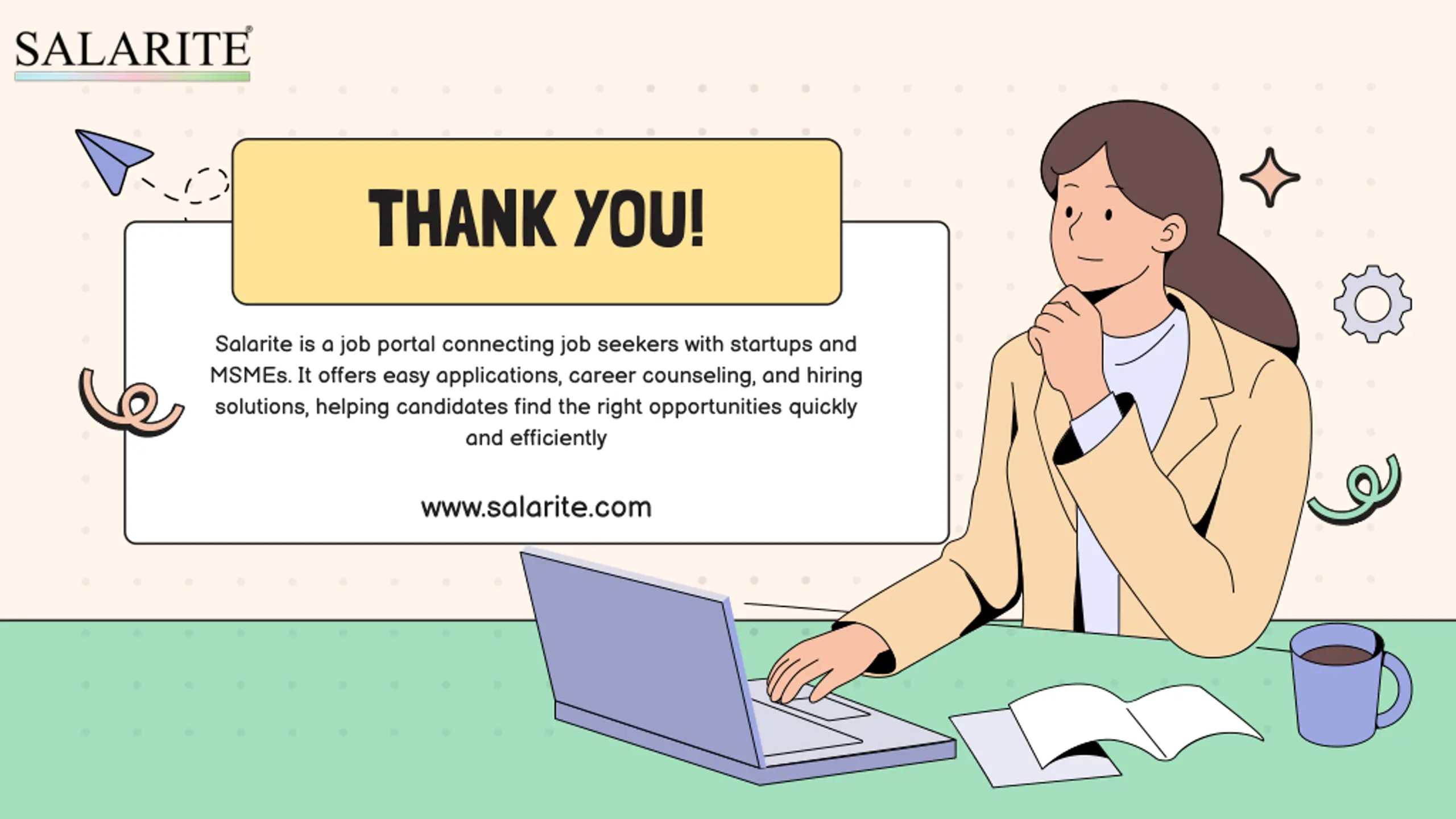 THANK YOU! Salarite is a job portal connecting job seekers with startups and MSMEs. It offers easy applications, career counseling, and hiring solutions, helping candidates find the right opportunities quickly and efficiently www.salarite.com