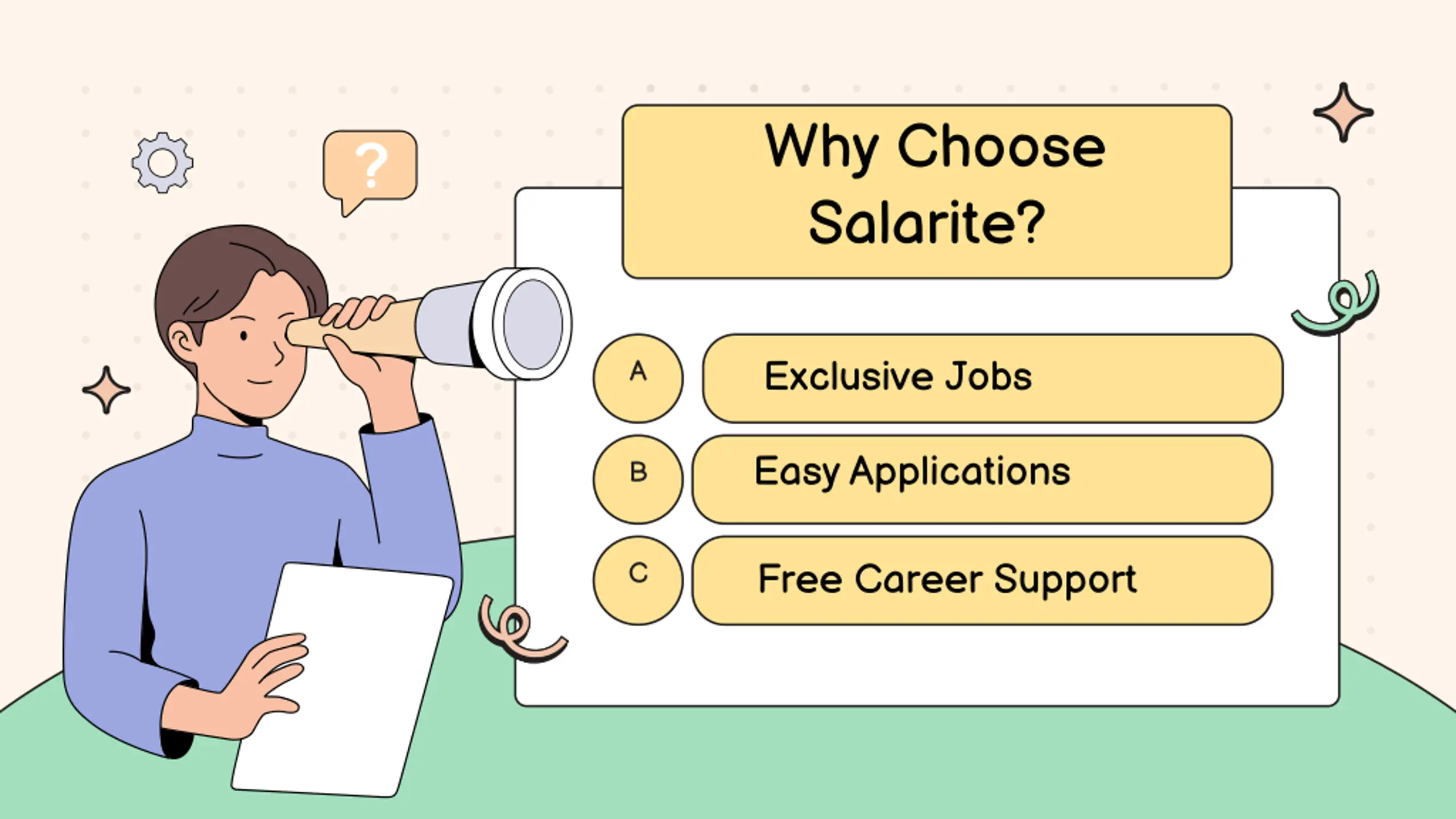 Why Choose Salarite? Exclusive Jobs A Easy Applications B Free Career Support C