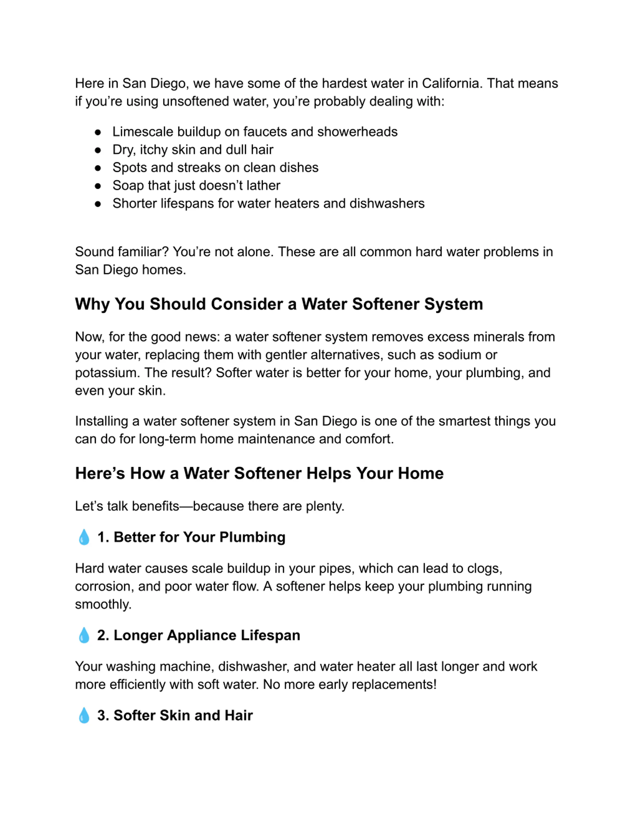 Here in San Diego, we have some of the hardest water in California. That means if you re using unsoftened water, you re probably dealing with: Limescale buildup on faucets and showerheads Dry, itchy skin and dull hair Spots and streaks on clean dishes Soap that just doesn t lather Shorter lifespans for water heaters and dishwashers Sound familiar? You re not alone. These are all common hard water problems in San Diego homes. Why You Should Consider a Water Softener System Now, for the good news: a water softener system removes excess minerals from your water, replacing them with gentler alternatives, such as sodium or potassium. The result? Softer water is better for your home, your plumbing, and even your skin. Installing a water softener system in San Diego is one of the smartest things you can do for long-term home maintenance and comfort. Here s How a Water Softener Helps Your Home Let s talk benefits because there are plenty. ? 1. Better for Your Plumbing Hard water causes scale buildup in your pipes, which can lead to clogs, corrosion, and poor water flow. A softener helps keep your plumbing running smoothly. ? 2. Longer Appliance Lifespan Your washing machine, dishwasher, and water heater all last longer and work more efficiently with soft water. No more early replacements! ? 3. Softer Skin and Hair