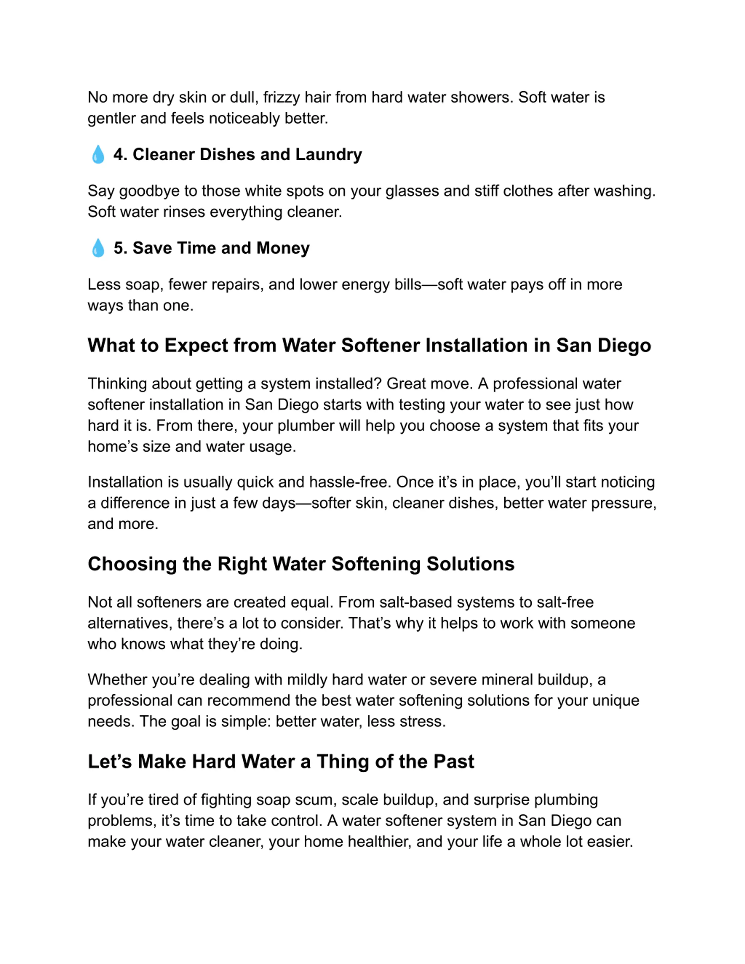No more dry skin or dull, frizzy hair from hard water showers. Soft water is gentler and feels noticeably better. ? 4. Cleaner Dishes and Laundry Say goodbye to those white spots on your glasses and stiff clothes after washing. Soft water rinses everything cleaner. ? 5. Save Time and Money Less soap, fewer repairs, and lower energy bills soft water pays off in more ways than one. What to Expect from Water Softener Installation in San Diego Thinking about getting a system installed? Great move. A professional water softener installation in San Diego starts with testing your water to see just how hard it is. From there, your plumber will help you choose a system that fits your home s size and water usage. Installation is usually quick and hassle-free. Once it s in place, you ll start noticing a difference in just a few days softer skin, cleaner dishes, better water pressure, and more. Choosing the Right Water Softening Solutions Not all softeners are created equal. From salt-based systems to salt-free alternatives, there s a lot to consider. That s why it helps to work with someone who knows what they re doing. Whether you re dealing with mildly hard water or severe mineral buildup, a professional can recommend the best water softening solutions for your unique needs. The goal is simple: better water, less stress. Let s Make Hard Water a Thing of the Past If you re tired of fighting soap scum, scale buildup, and surprise plumbing problems, it s time to take control. A water softener system in San Diego can make your water cleaner, your home healthier, and your life a whole lot easier.