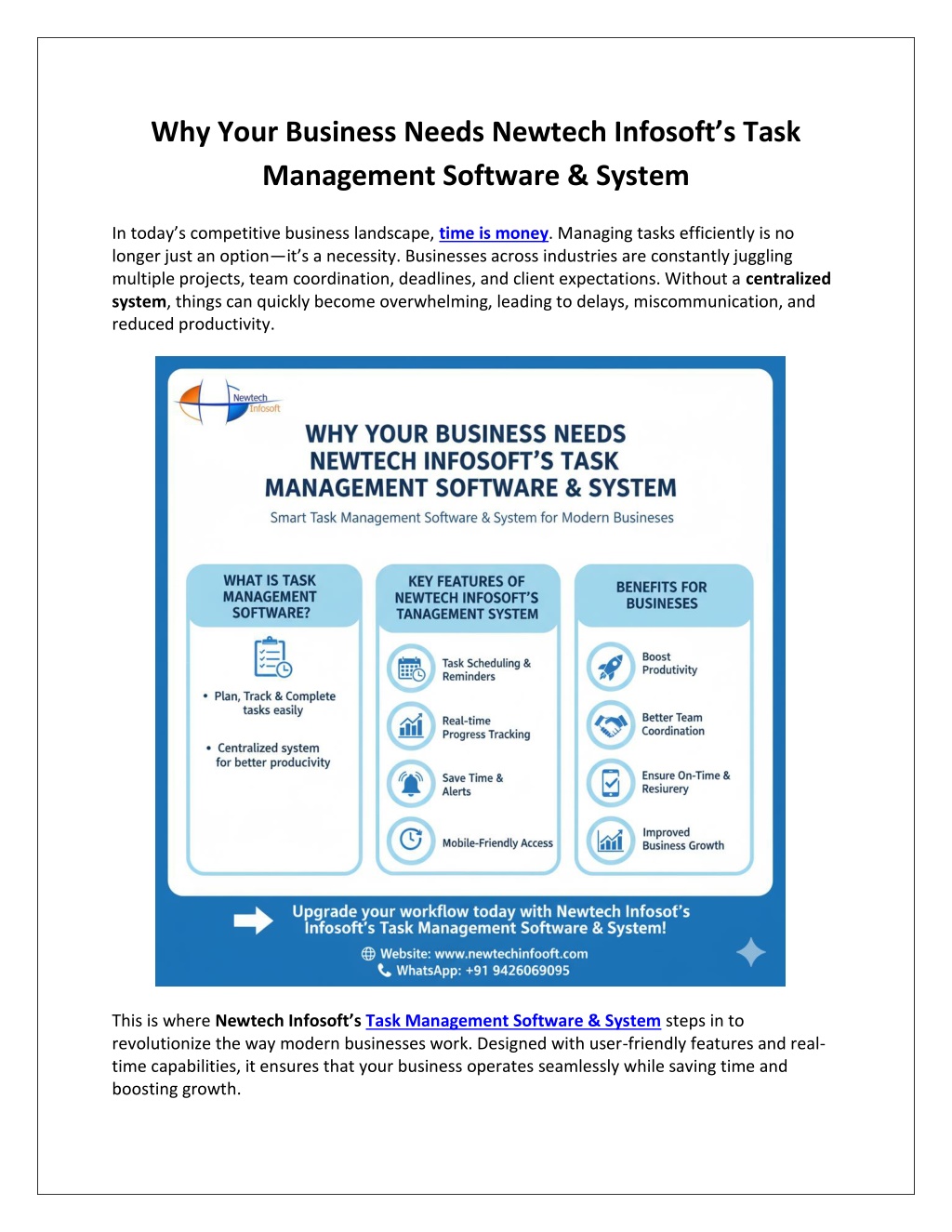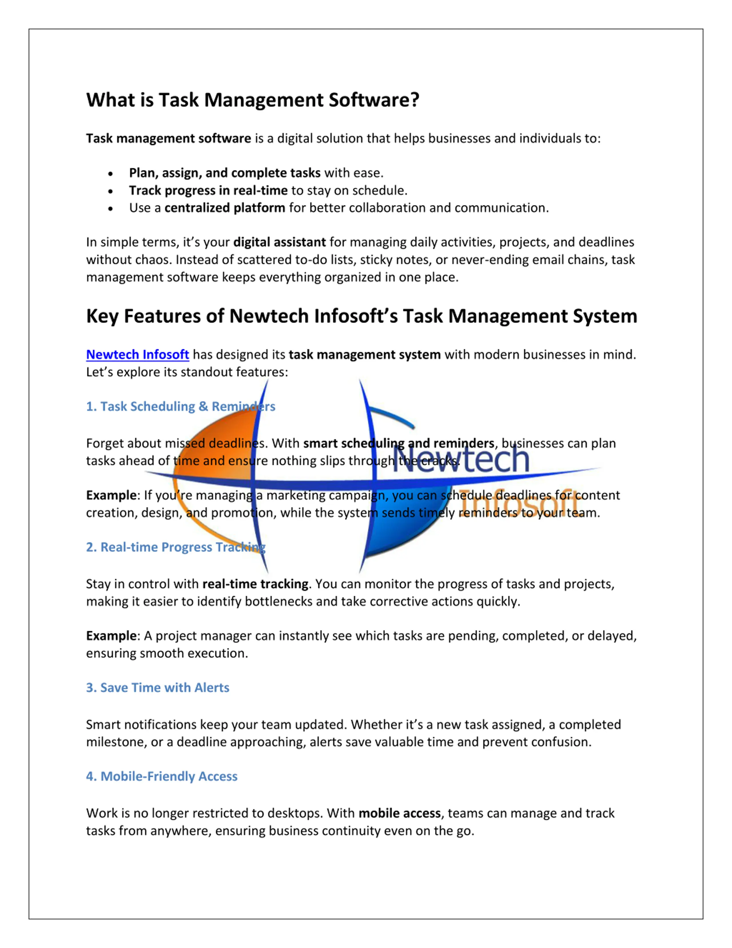 What is Task Management Software? Task management software is a digital solution that helps businesses and individuals to: Plan, assign, and complete tasks with ease. Track progress in real-time to stay on schedule. Use a centralized platform for better collaboration and communication. In simple terms, it s your digital assistant for managing daily activities, projects, and deadlines without chaos. Instead of scattered to-do lists, sticky notes, or never-ending email chains, task management software keeps everything organized in one place. Key Features of Newtech Infosoft s Task Management System Newtech Infosoft has designed its task management system with modern businesses in mind. Let s explore its standout features: 1. Task Scheduling & Reminders Forget about missed deadlines. With smart scheduling and reminders, businesses can plan tasks ahead of time and ensure nothing slips through the cracks. Example: If you re managing a marketing campaign, you can schedule deadlines for content creation, design, and promotion, while the system sends timely reminders to your team. 2. Real-time Progress Tracking Stay in control with real-time tracking. You can monitor the progress of tasks and projects, making it easier to identify bottlenecks and take corrective actions quickly. Example: A project manager can instantly see which tasks are pending, completed, or delayed, ensuring smooth execution. 3. Save Time with Alerts Smart notifications keep your team updated. Whether it s a new task assigned, a completed milestone, or a deadline approaching, alerts save valuable time and prevent confusion. 4. Mobile-Friendly Access Work is no longer restricted to desktops. With mobile access, teams can manage and track tasks from anywhere, ensuring business continuity even on the go.