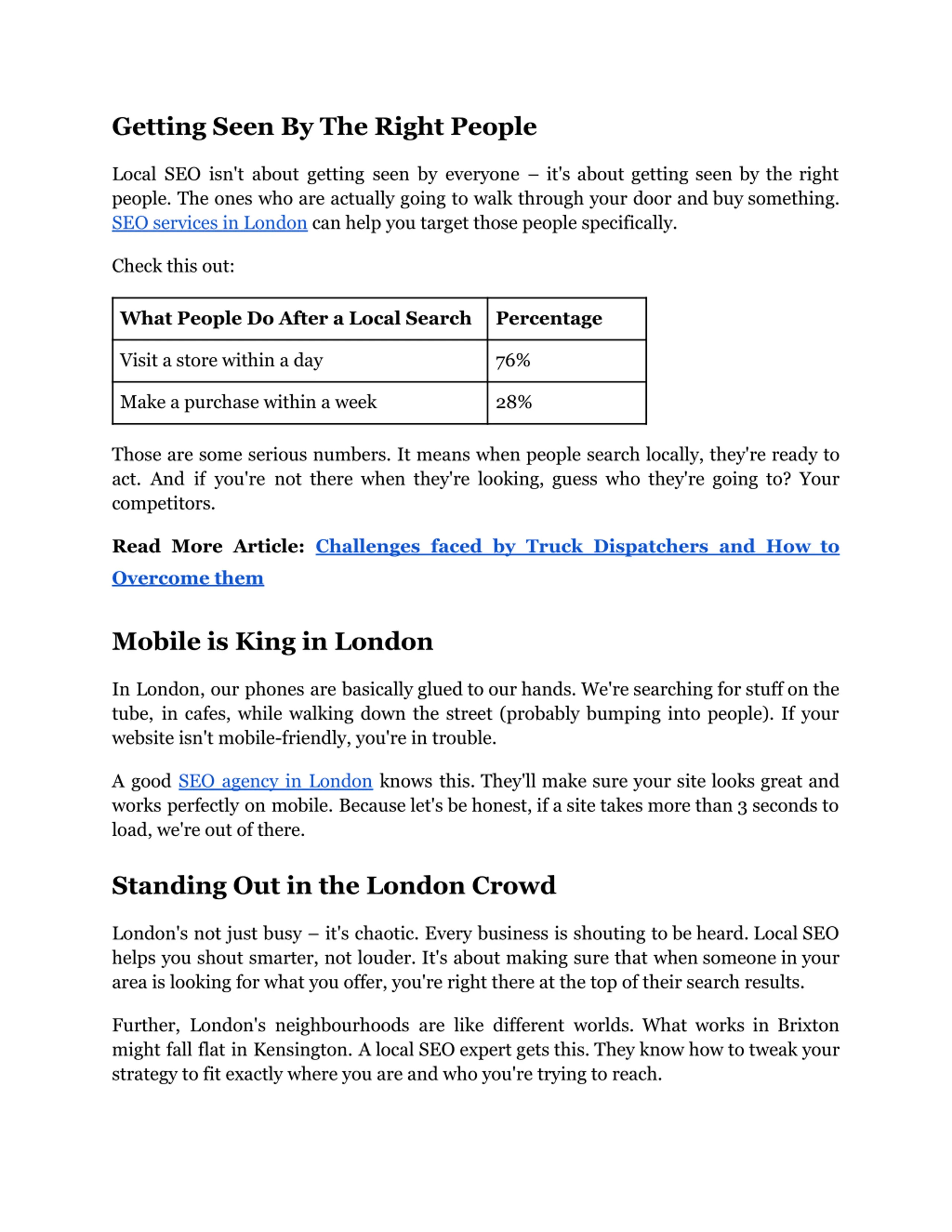 Getting Seen By The Right People Local SEO isn't about getting seen by everyone it's about getting seen by the right people. The ones who are actually going to walk through your door and buy something. SEO services in London can help you target those people specifically. Check this out: What People Do After a Local Search Percentage Visit a store within a day 76% Make a purchase within a week 28% Those are some serious numbers. It means when people search locally, they're ready to act. And if you're not there when they're looking, guess who they're going to? Your competitors. Read More Article: Challenges faced by Truck Dispatchers and How to Overcome them Mobile is King in London In London, our phones are basically glued to our hands. We're searching for stuff on the tube, in cafes, while walking down the street (probably bumping into people). If your website isn't mobile-friendly, you're in trouble. A good SEO agency in London knows this. They'll make sure your site looks great and works perfectly on mobile. Because let's be honest, if a site takes more than 3 seconds to load, we're out of there. Standing Out in the London Crowd London's not just busy it's chaotic. Every business is shouting to be heard. Local SEO helps you shout smarter, not louder. It's about making sure that when someone in your area is looking for what you offer, you're right there at the top of their search results. Further, London's neighbourhoods are like different worlds. What works in Brixton might fall flat in Kensington. A local SEO expert gets this. They know how to tweak your strategy to fit exactly where you are and who you're trying to reach.