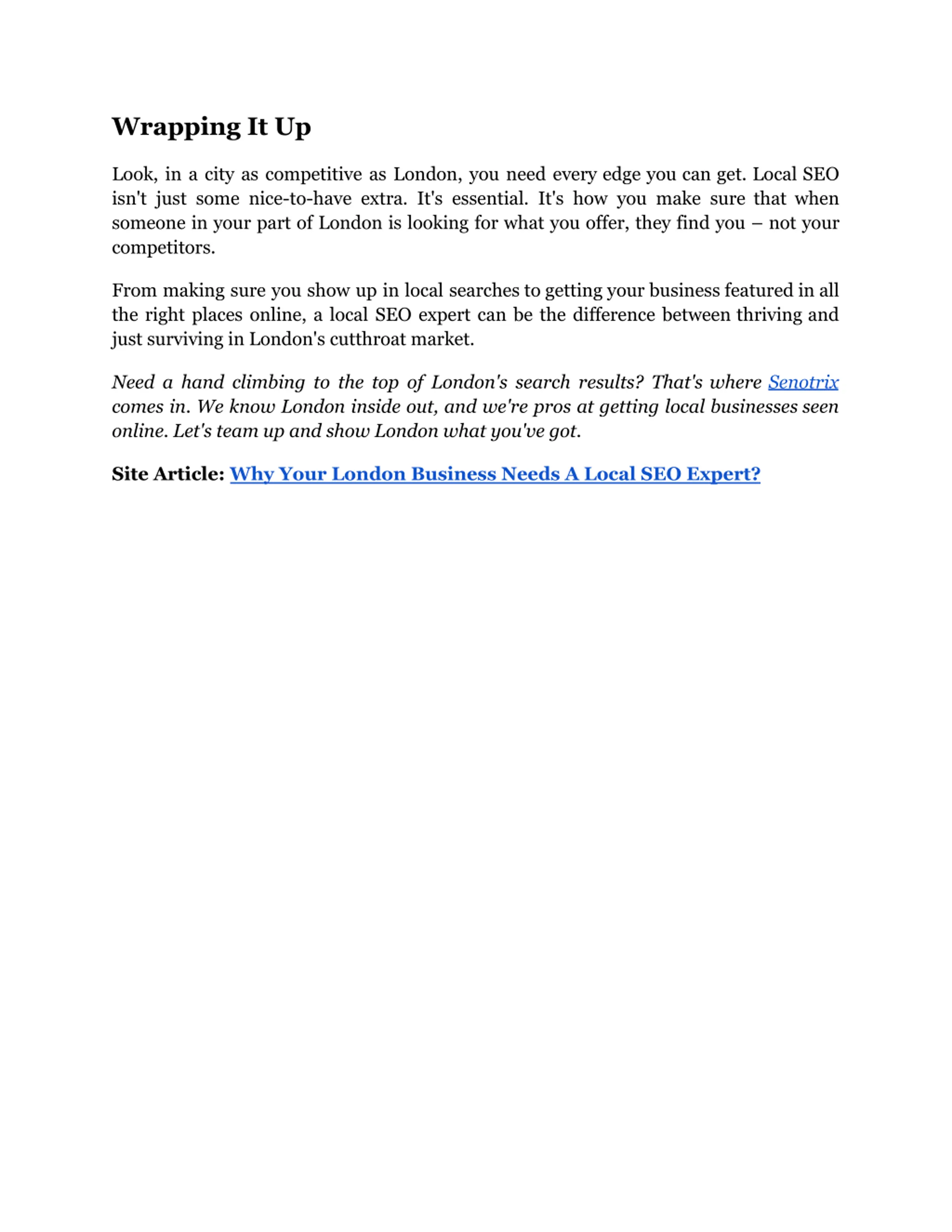 Wrapping It Up Look, in a city as competitive as London, you need every edge you can get. Local SEO isn't just some nice-to-have extra. It's essential. It's how you make sure that when someone in your part of London is looking for what you offer, they find you not your competitors. From making sure you show up in local searches to getting your business featured in all the right places online, a local SEO expert can be the difference between thriving and just surviving in London's cutthroat market. Need a hand climbing to the top of London's search results? That's where Senotrix comes in. We know London inside out, and we're pros at getting local businesses seen online. Let's team up and show London what you've got. Site Article: Why Your London Business Needs A Local SEO Expert?