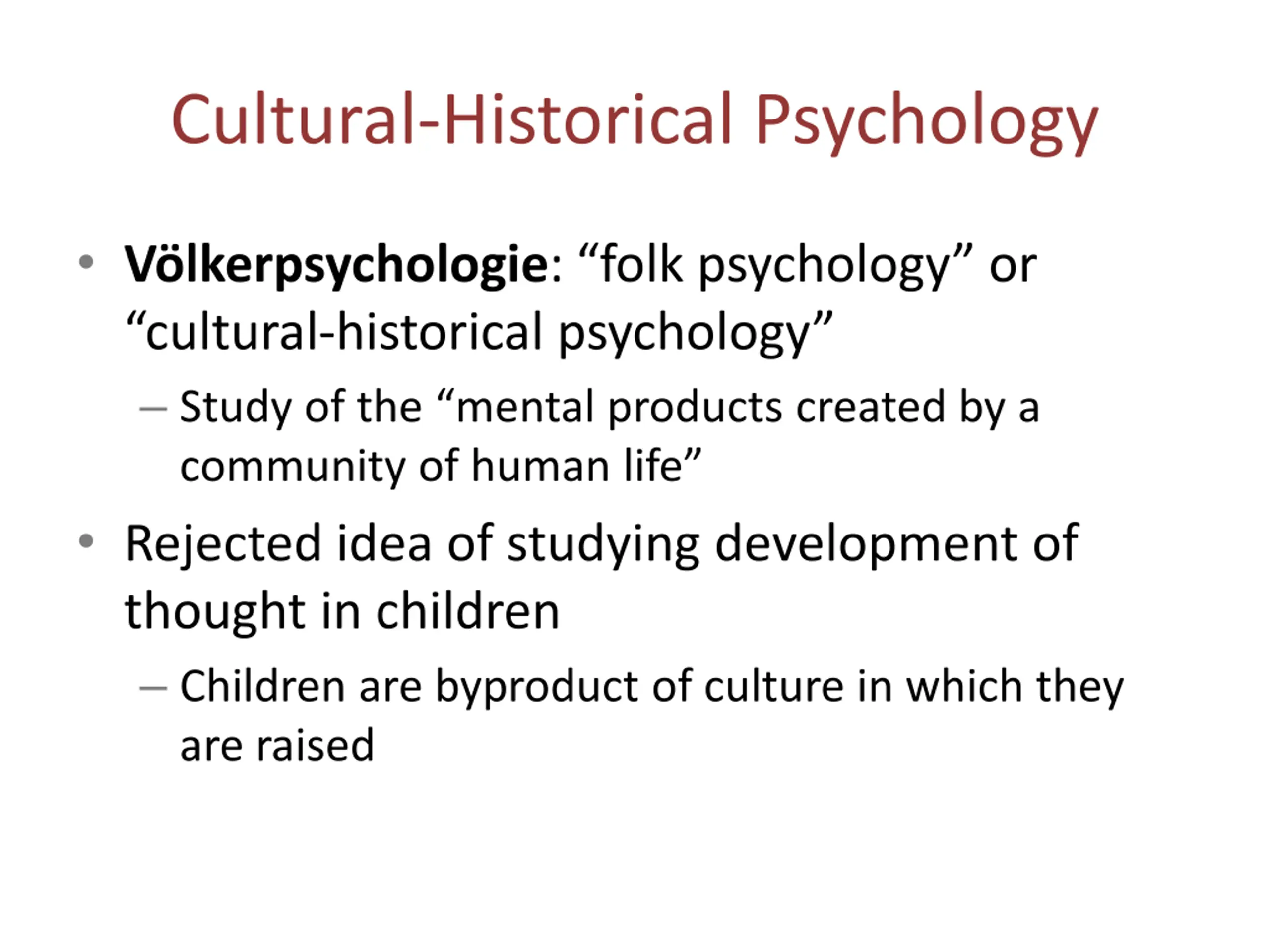 Cultural-Historical Psychology V lkerpsychologie: folk psychology or cultural-historical psychology Study of the mental products created by a community of human life Rejected idea of studying development of thought in children Children are byproduct of culture in which they are raised