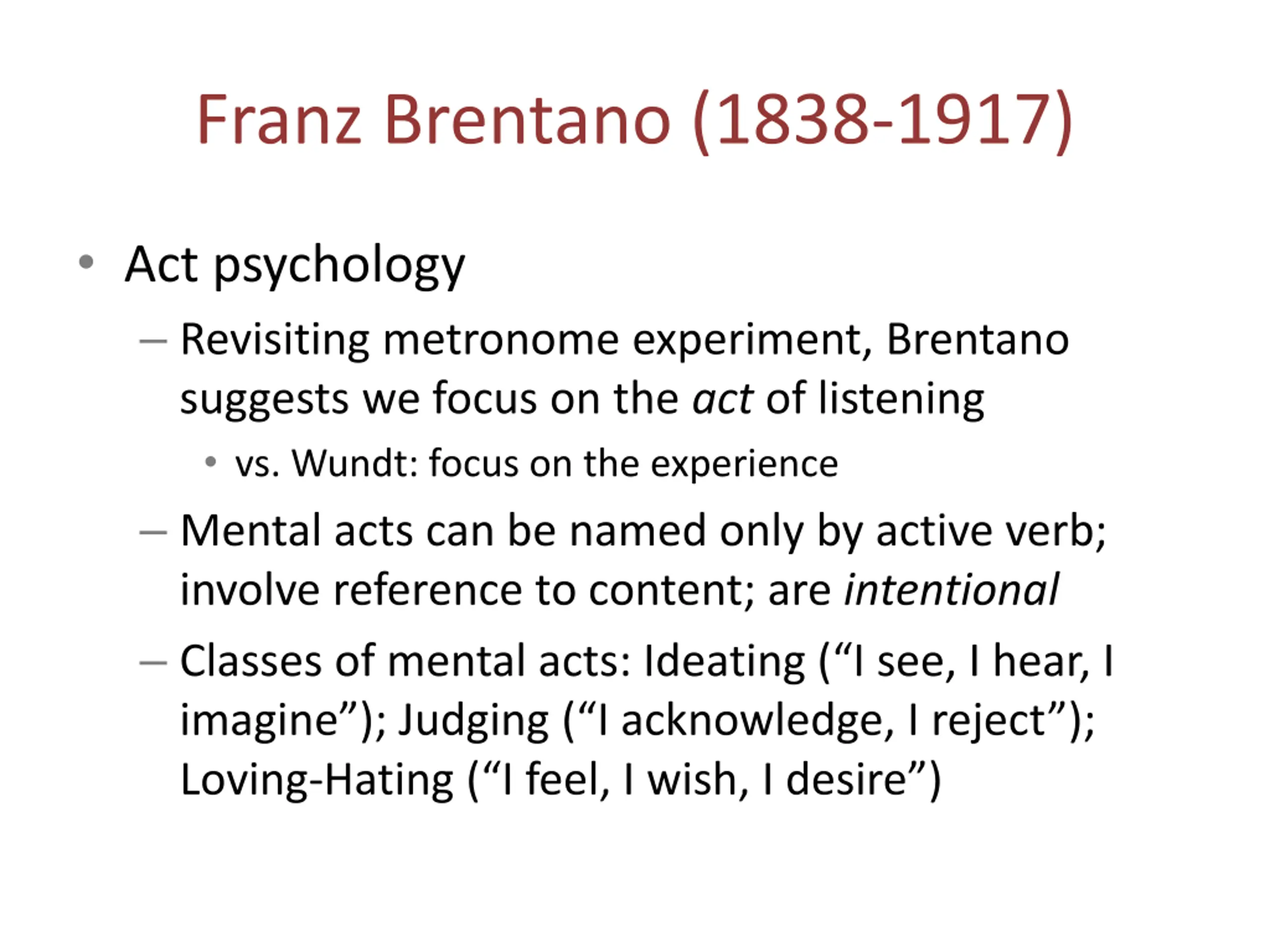 Franz Brentano (1838-1917) Act psychology Revisiting metronome experiment, Brentano suggests we focus on the act of listening vs. Wundt: focus on the experience Mental acts can be named only by active verb; involve reference to content; are intentional Classes of mental acts: Ideating ( I see, I hear, I imagine ); Judging ( I acknowledge, I reject ); Loving-Hating ( I feel, I wish, I desire )