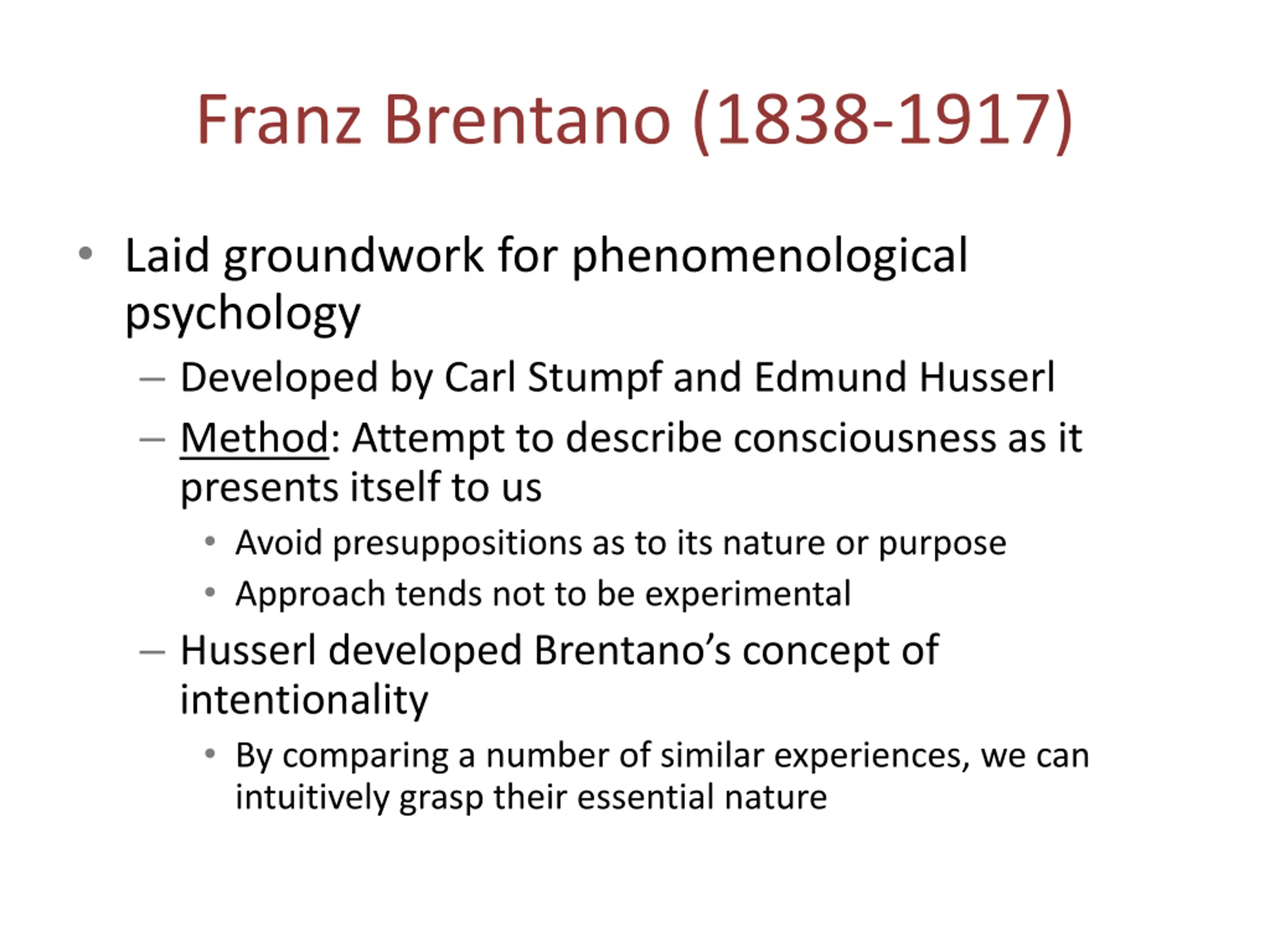 Franz Brentano (1838-1917) Laid groundwork for phenomenological psychology Developed by Carl Stumpf and Edmund Husserl Method: Attempt to describe consciousness as it presents itself to us Avoid presuppositions as to its nature or purpose Approach tends not to be experimental Husserl developed Brentano s concept of intentionality By comparing a number of similar experiences, we can intuitively grasp their essential nature