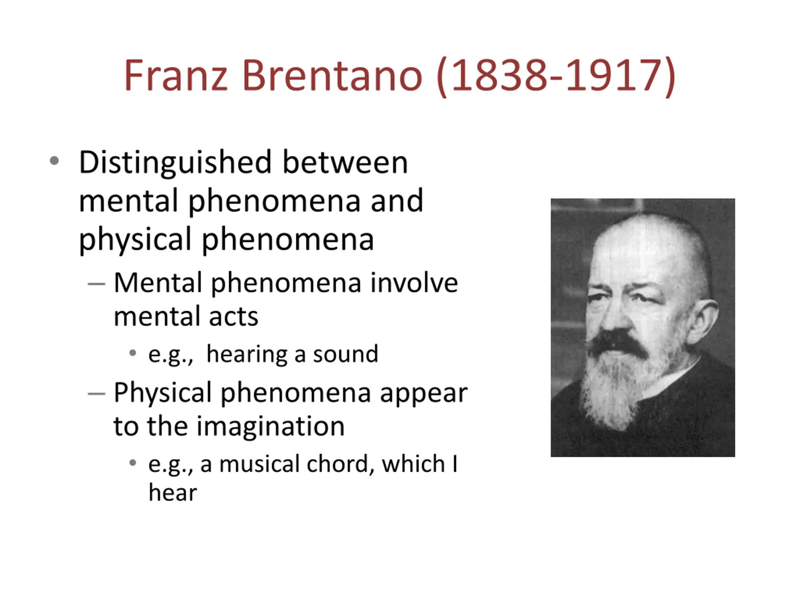 Franz Brentano (1838-1917) Distinguished between mental phenomena and physical phenomena Mental phenomena involve mental acts e.g., hearing a sound Physical phenomena appear to the imagination e.g., a musical chord, which I hear