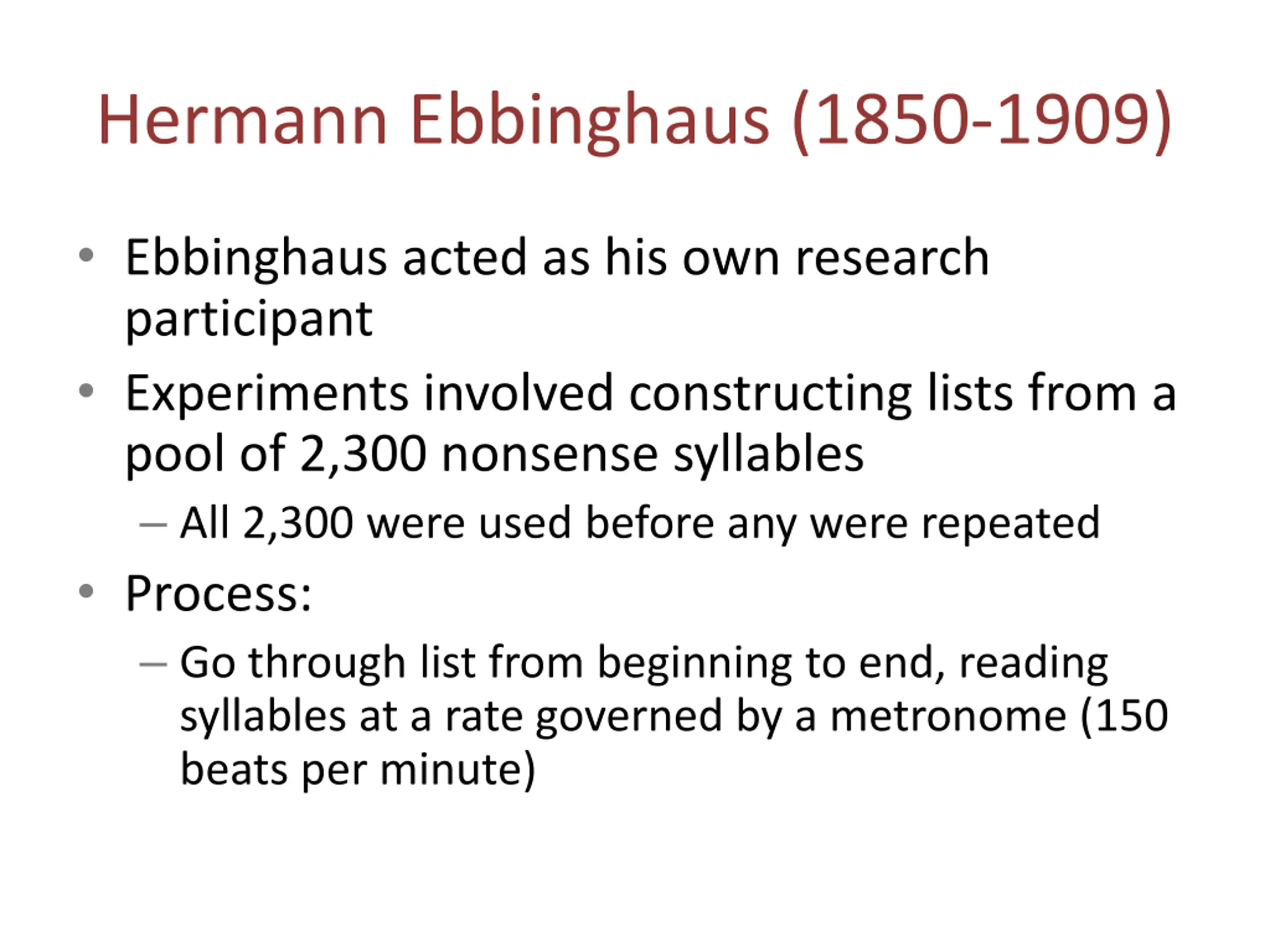 Hermann Ebbinghaus (1850-1909) Ebbinghaus acted as his own research participant Experiments involved constructing lists from a pool of 2,300 nonsense syllables All 2,300 were used before any were repeated Process: Go through list from beginning to end, reading syllables at a rate governed by a metronome (150 beats per minute)