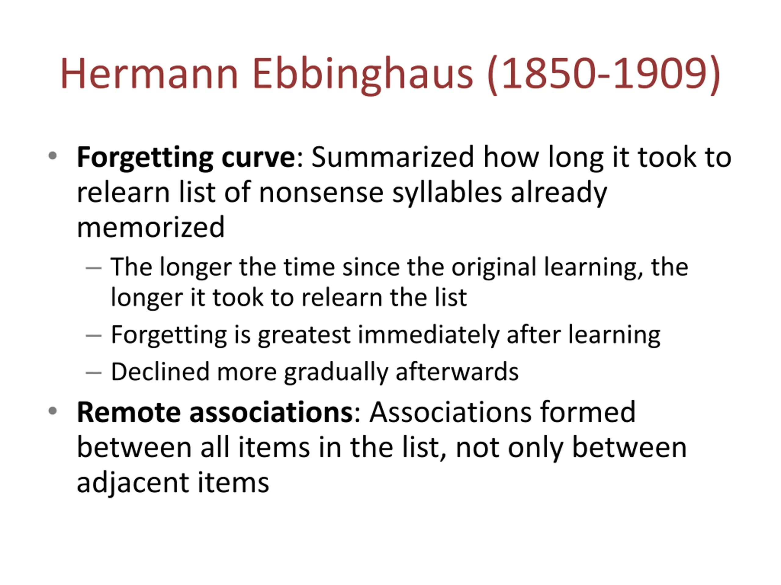 Hermann Ebbinghaus (1850-1909) Forgetting curve: Summarized how long it took to relearn list of nonsense syllables already memorized The longer the time since the original learning, the longer it took to relearn the list Forgetting is greatest immediately after learning Declined more gradually afterwards Remote associations: Associations formed between all items in the list, not only between adjacent items