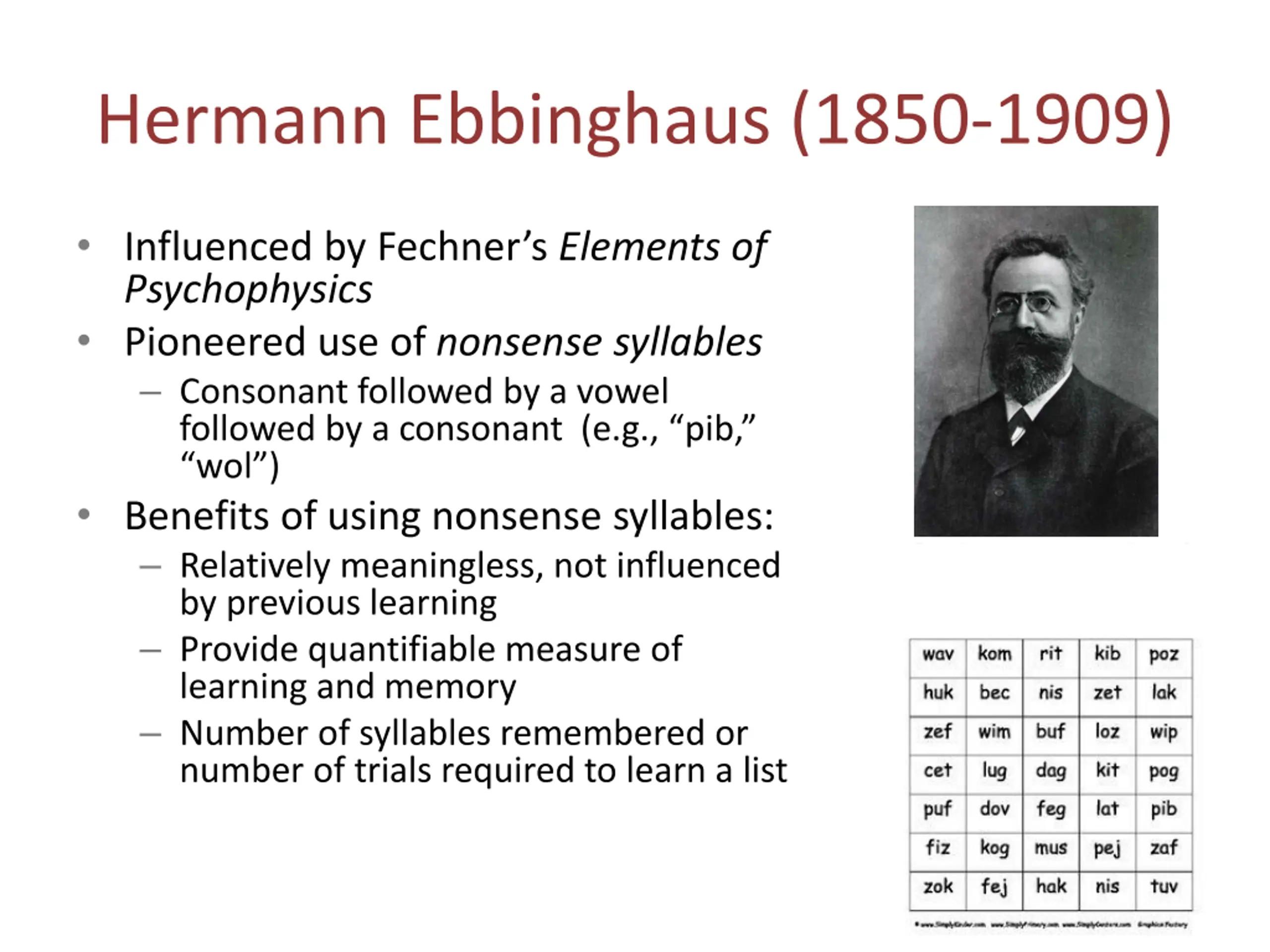 Hermann Ebbinghaus (1850-1909) Influenced by Fechner s Elements of Psychophysics Pioneered use of nonsense syllables Consonant followed by a vowel followed by a consonant (e.g., pib, wol ) Benefits of using nonsense syllables: Relatively meaningless, not influenced by previous learning Provide quantifiable measure of learning and memory Number of syllables remembered or number of trials required to learn a list