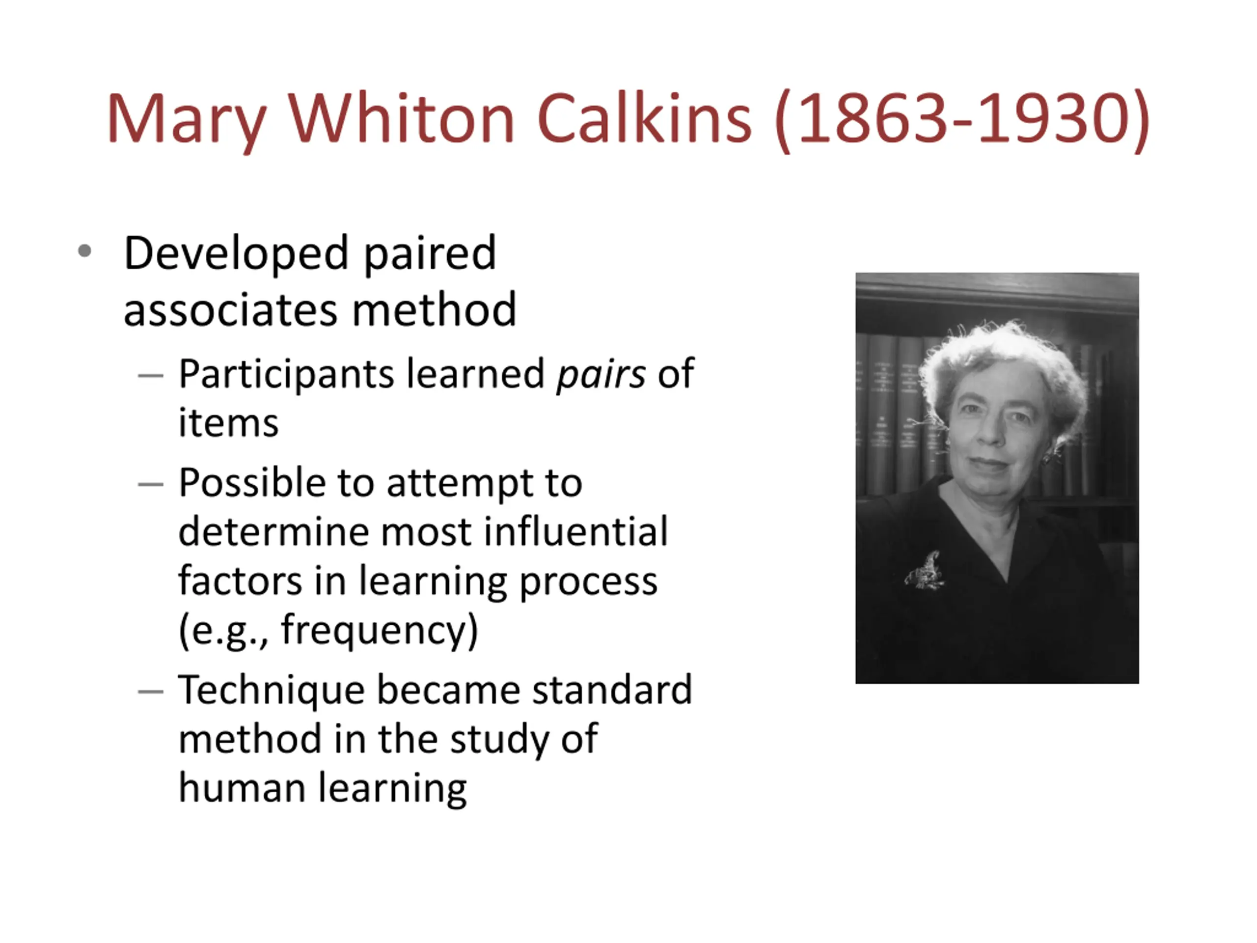 Mary Whiton Calkins (1863-1930) Developed paired associates method Participants learned pairs of items Possible to attempt to determine most influential factors in learning process (e.g., frequency) Technique became standard method in the study of human learning