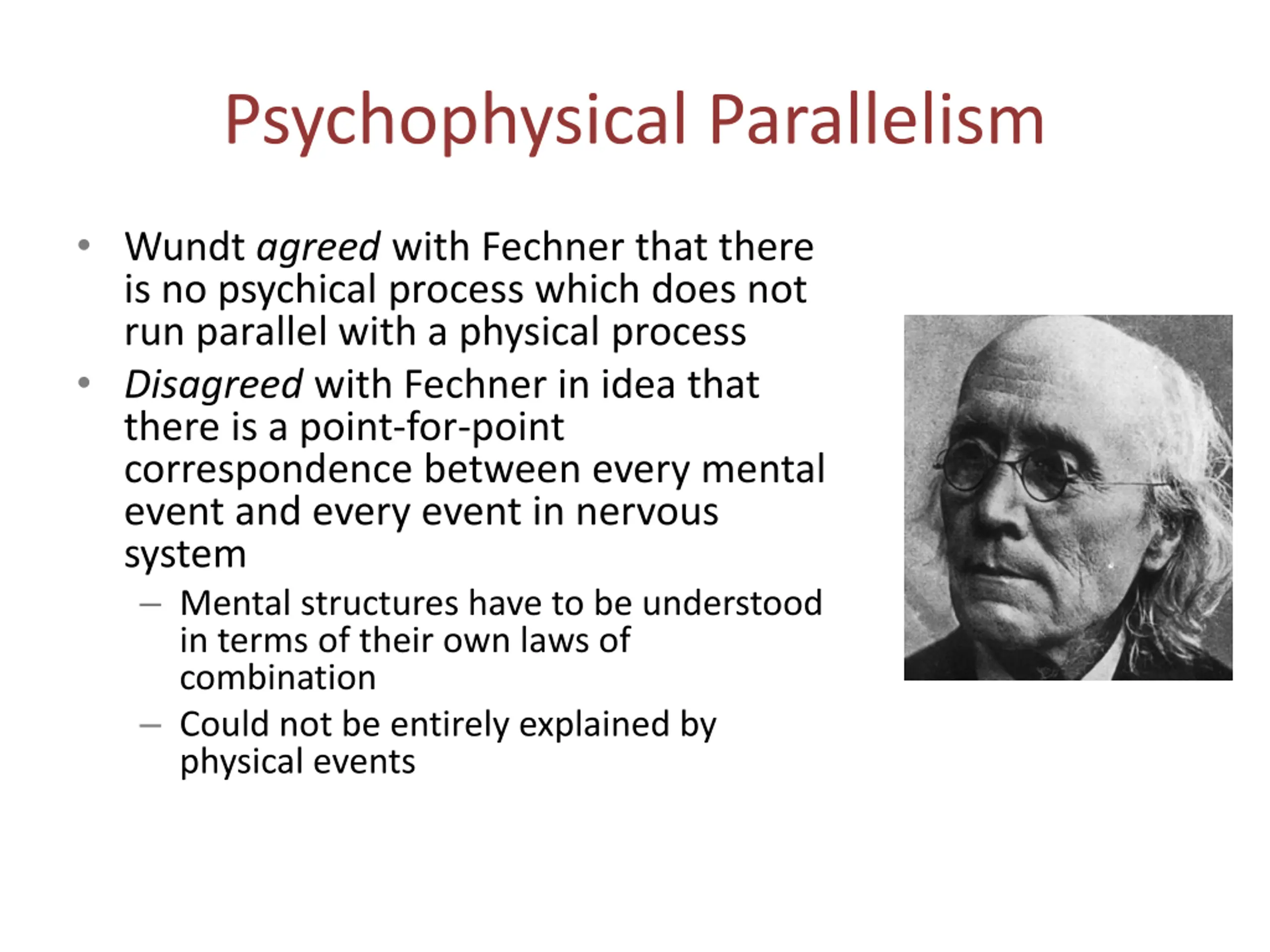 Psychophysical Parallelism Wundt agreed with Fechner that there is no psychical process which does not run parallel with a physical process Disagreed with Fechner in idea that there is a point-for-point correspondence between every mental event and every event in nervous system Mental structures have to be understood in terms of their own laws of combination Could not be entirely explained by physical events