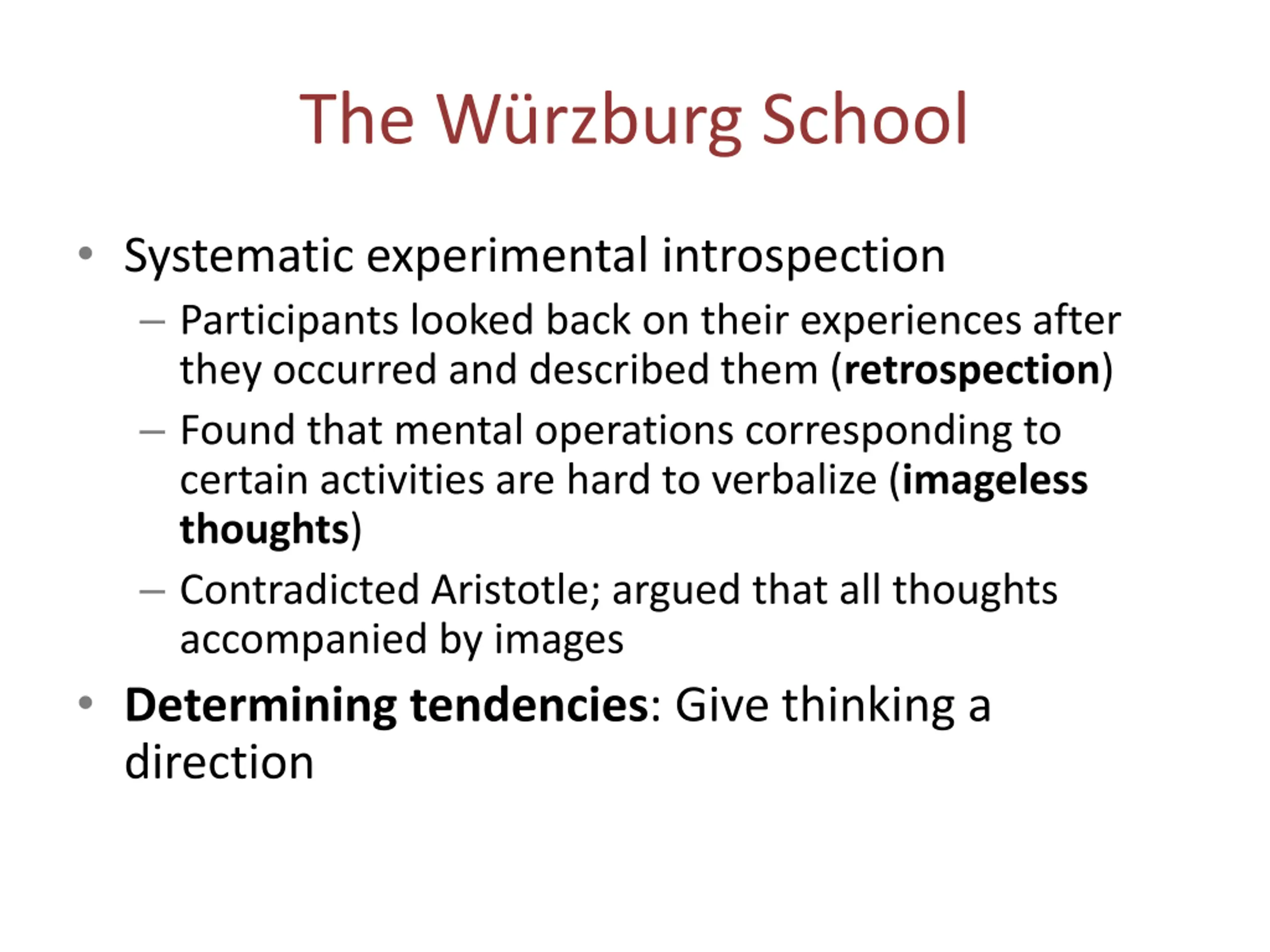 The Wrzburg School Systematic experimental introspection Participants looked back on their experiences after they occurred and described them (retrospection) Found that mental operations corresponding to certain activities are hard to verbalize (imageless thoughts) Contradicted Aristotle; argued that all thoughts accompanied by images Determining tendencies: Give thinking a direction