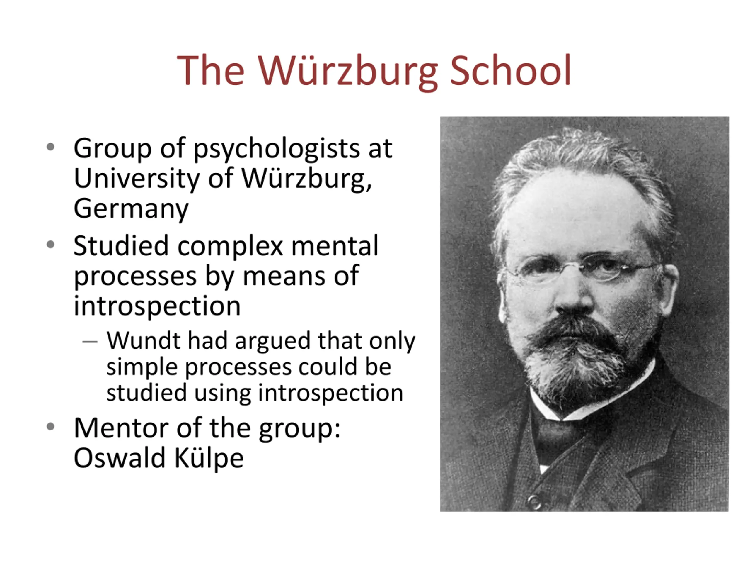 The Wrzburg School Group of psychologists at University of W rzburg, Germany Studied complex mental processes by means of introspection Wundt had argued that only simple processes could be studied using introspection Mentor of the group: Oswald K lpe