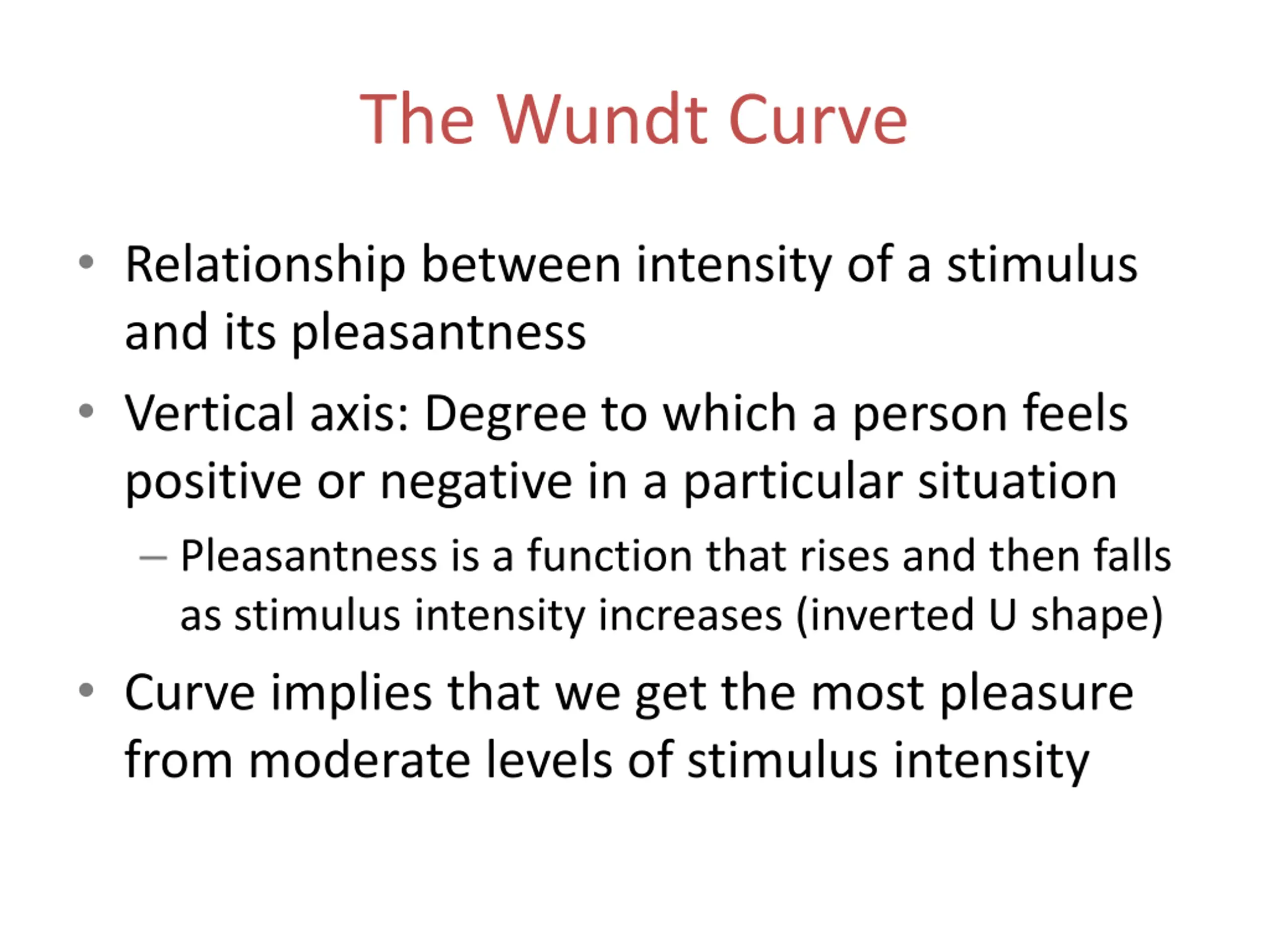 The Wundt Curve Relationship between intensity of a stimulus and its pleasantness Vertical axis: Degree to which a person feels positive or negative in a particular situation Pleasantness is a function that rises and then falls as stimulus intensity increases (inverted U shape) Curve implies that we get the most pleasure from moderate levels of stimulus intensity