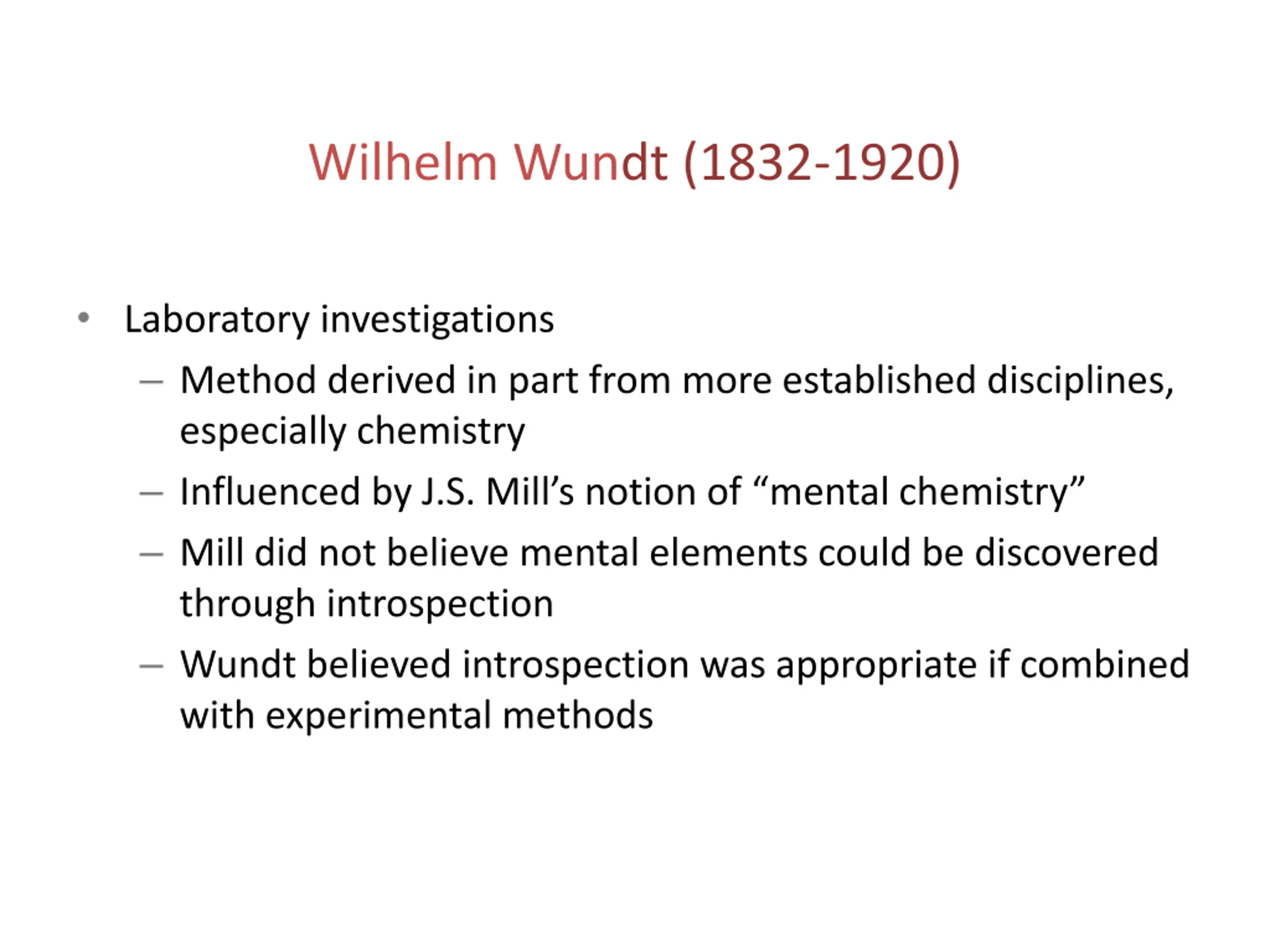 Wilhelm Wundt (1832-1920) Laboratory investigations Method derived in part from more established disciplines, especially chemistry Influenced by J.S. Mill s notion of mental chemistry Mill did not believe mental elements could be discovered through introspection Wundt believed introspection was appropriate if combined with experimental methods