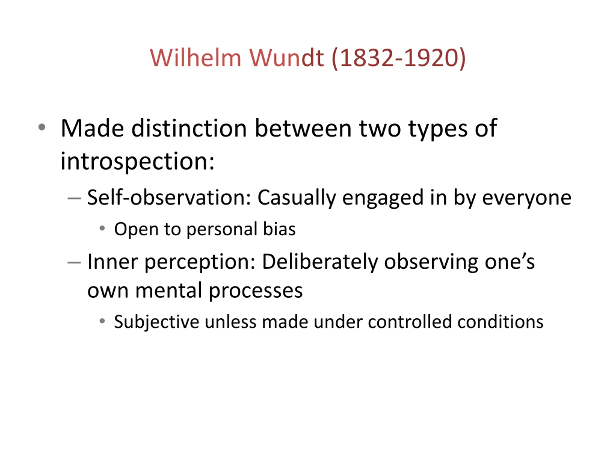 Wilhelm Wundt (1832-1920) Made distinction between two types of introspection: Self-observation: Casually engaged in by everyone Open to personal bias Inner perception: Deliberately observing one s own mental processes Subjective unless made under controlled conditions