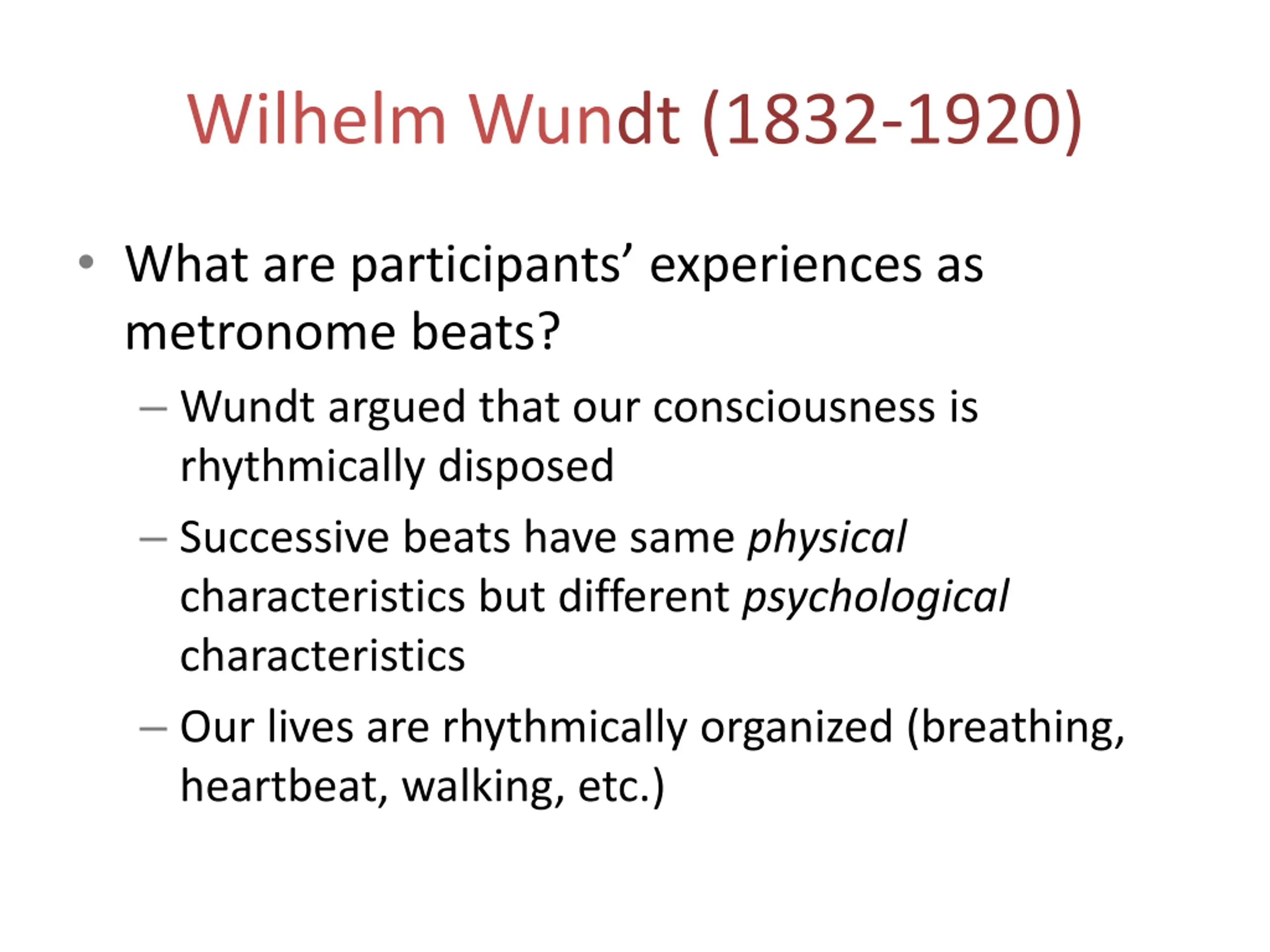 Wilhelm Wundt (1832-1920) What are participants experiences as metronome beats? Wundt argued that our consciousness is rhythmically disposed Successive beats have same physical characteristics but different psychological characteristics Our lives are rhythmically organized (breathing, heartbeat, walking, etc.)