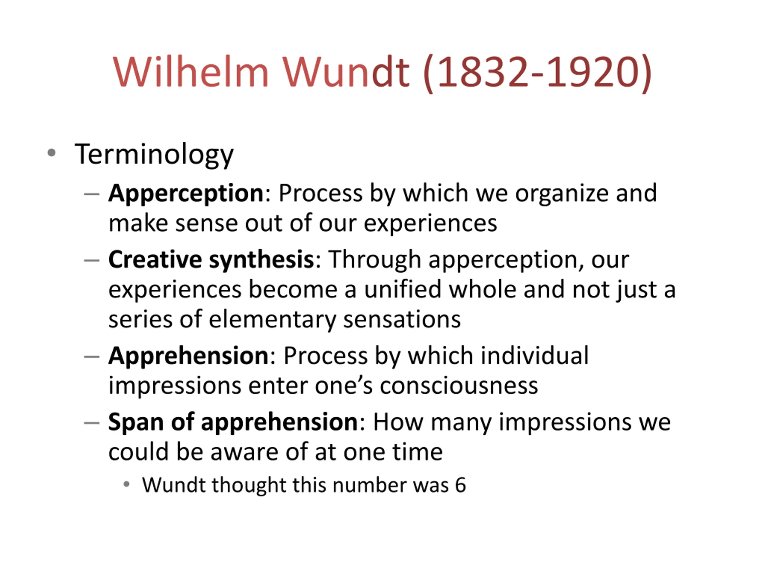 Wilhelm Wundt (1832-1920) Terminology Apperception: Process by which we organize and make sense out of our experiences Creative synthesis: Through apperception, our experiences become a unified whole and not just a series of elementary sensations Apprehension: Process by which individual impressions enter one s consciousness Span of apprehension: How many impressions we could be aware of at one time Wundt thought this number was 6