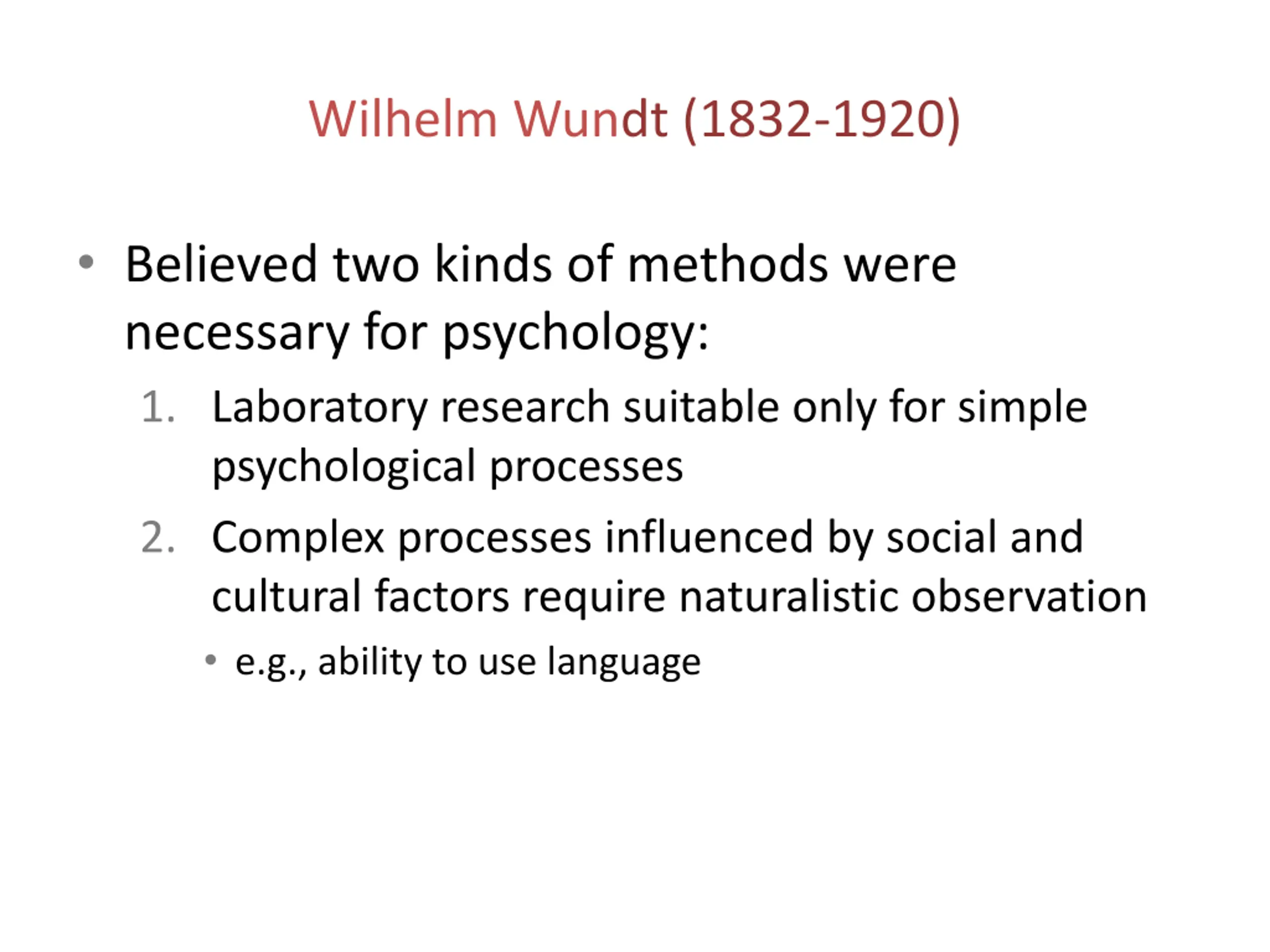 Wilhelm Wundt (1832-1920) Believed two kinds of methods were necessary for psychology: 1. Laboratory research suitable only for simple psychological processes 2. Complex processes influenced by social and cultural factors require naturalistic observation e.g., ability to use language