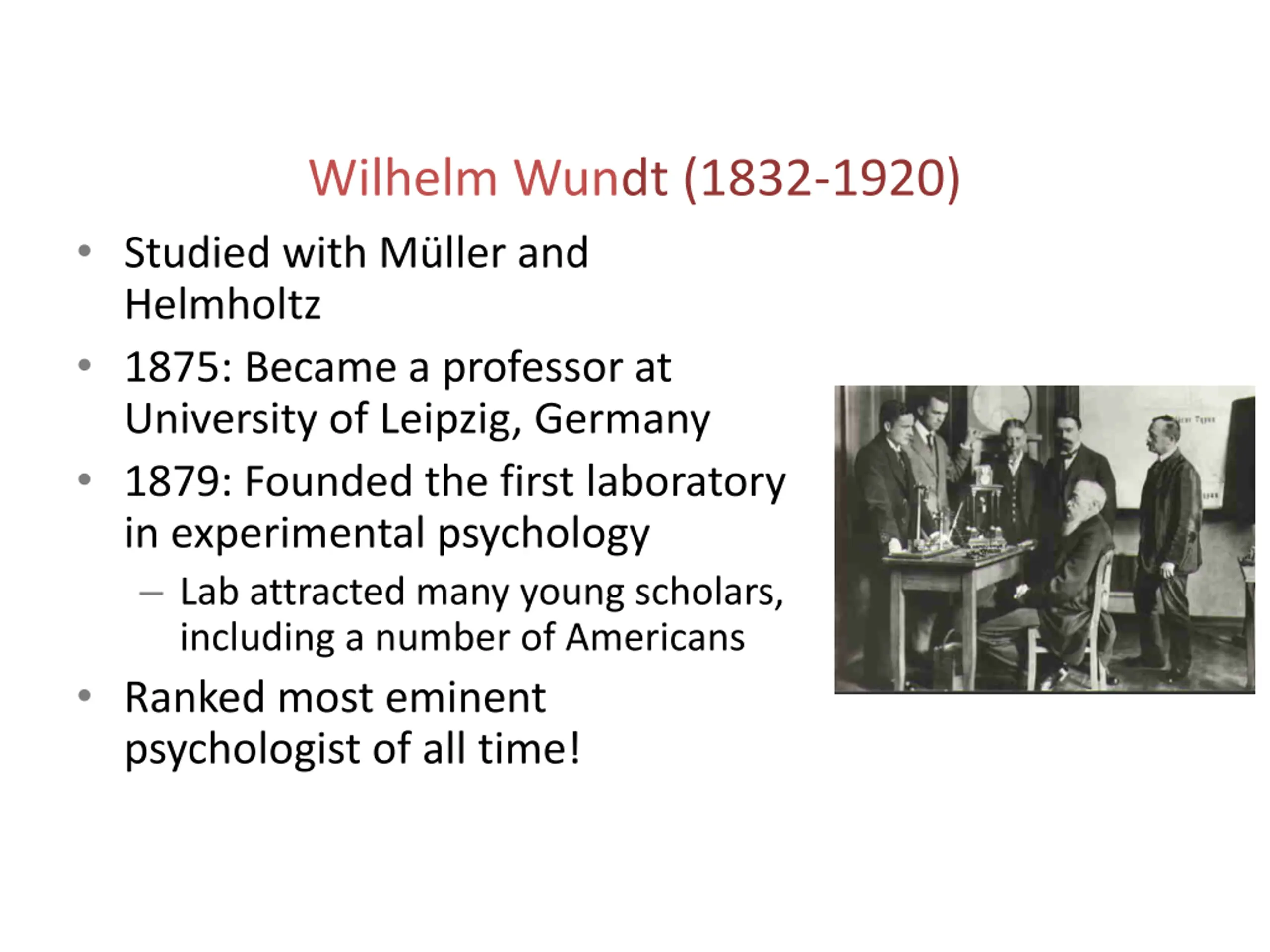 Wilhelm Wundt (1832-1920) Studied with M ller and Helmholtz 1875: Became a professor at University of Leipzig, Germany 1879: Founded the first laboratory in experimental psychology Lab attracted many young scholars, including a number of Americans Ranked most eminent psychologist of all time!