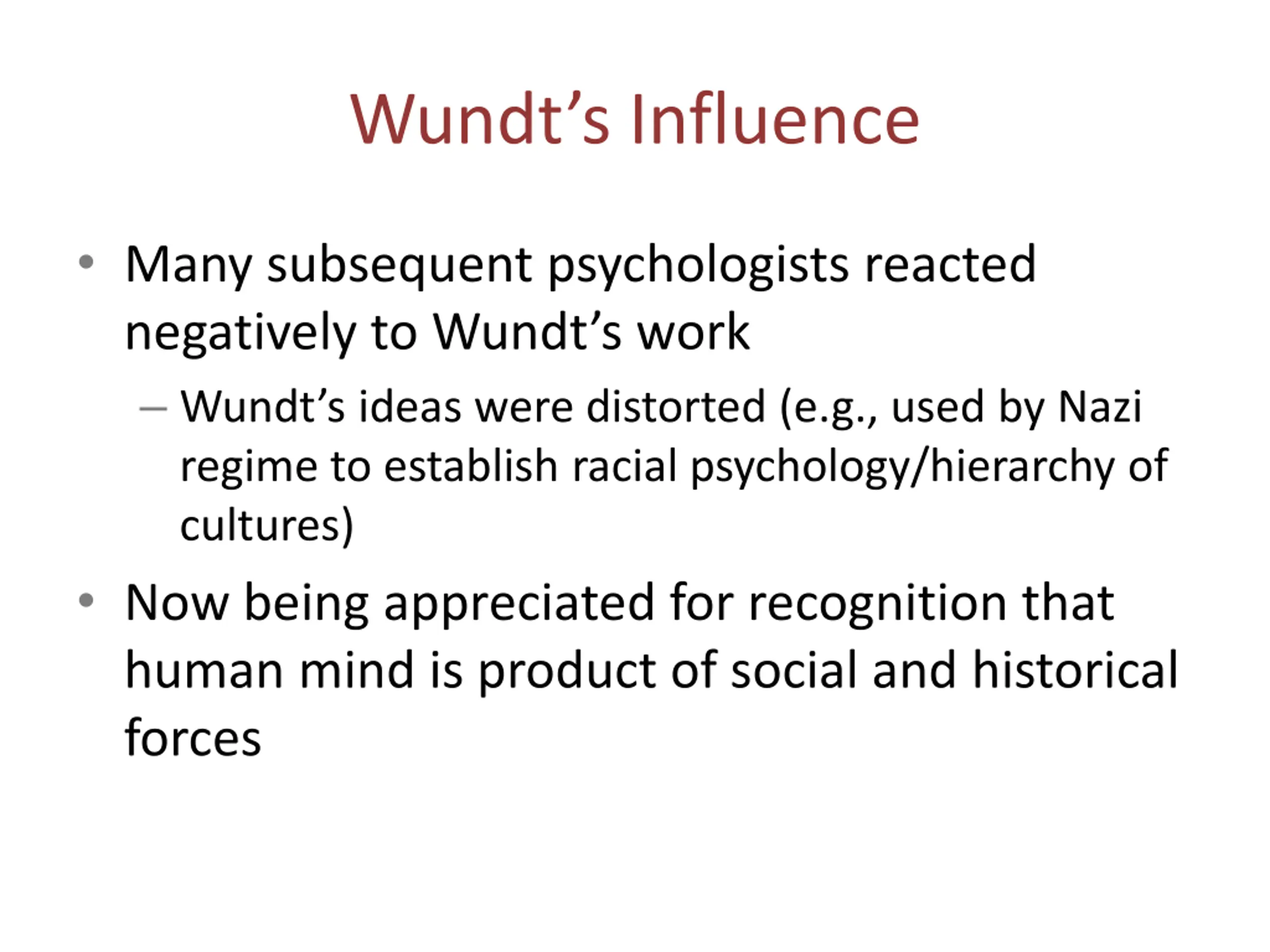 Wundts Influence Many subsequent psychologists reacted negatively to Wundt s work Wundt s ideas were distorted (e.g., used by Nazi regime to establish racial psychology/hierarchy of cultures) Now being appreciated for recognition that human mind is product of social and historical forces
