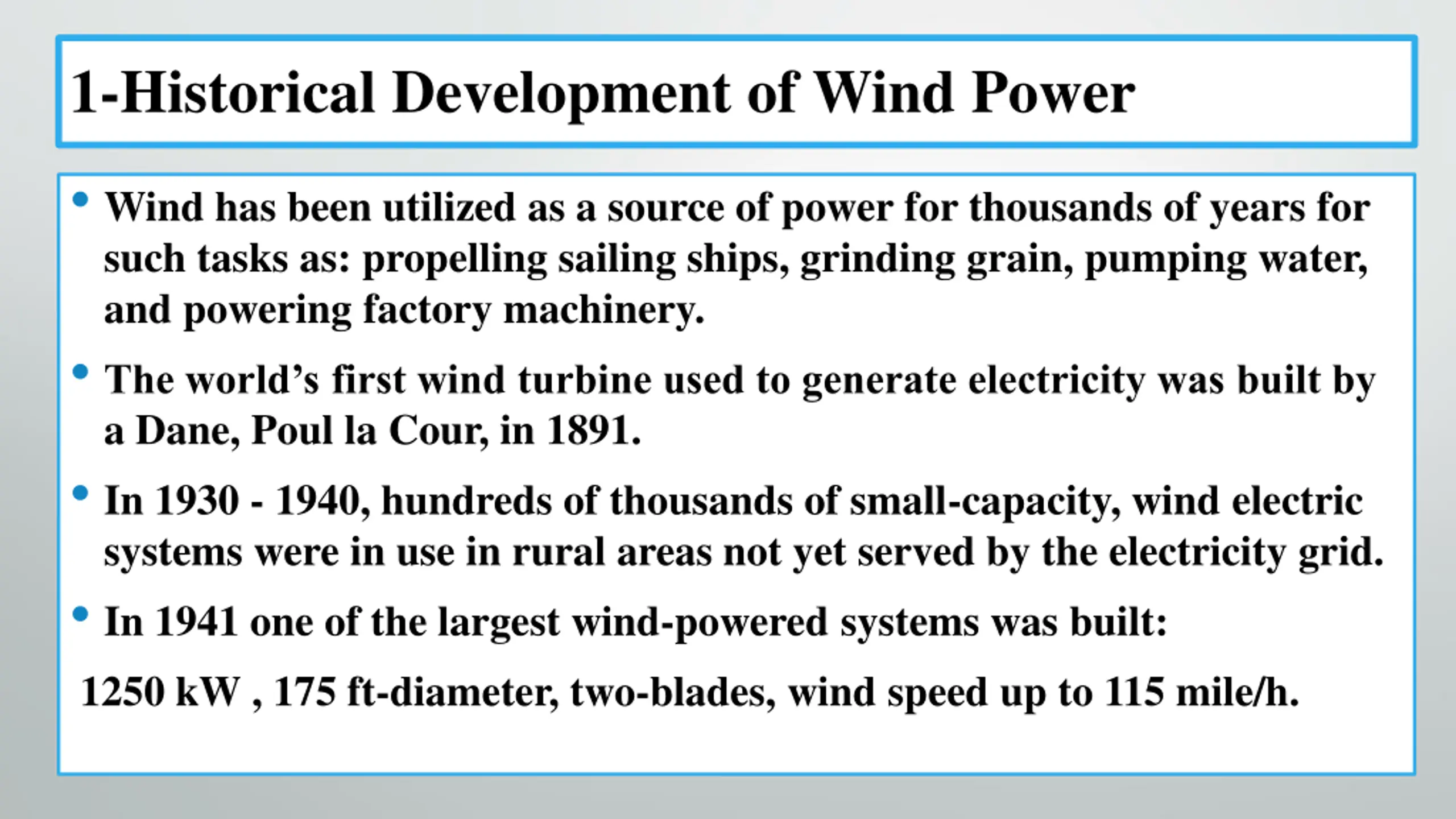 1-Historical Development of Wind Power Wind has been utilized as a source of power for thousands of years for such tasks as: propelling sailing ships, grinding grain, pumping water, and powering factory machinery. The world s first wind turbine used to generate electricity was built by a Dane, Poul la Cour, in 1891. In 1930 - 1940, hundreds of thousands of small-capacity, wind electric systems were in use in rural areas not yet served by the electricity grid. In 1941 one of the largest wind-powered systems was built: 1250 kW , 175 ft-diameter, two-blades, wind speed up to 115 mile/h.