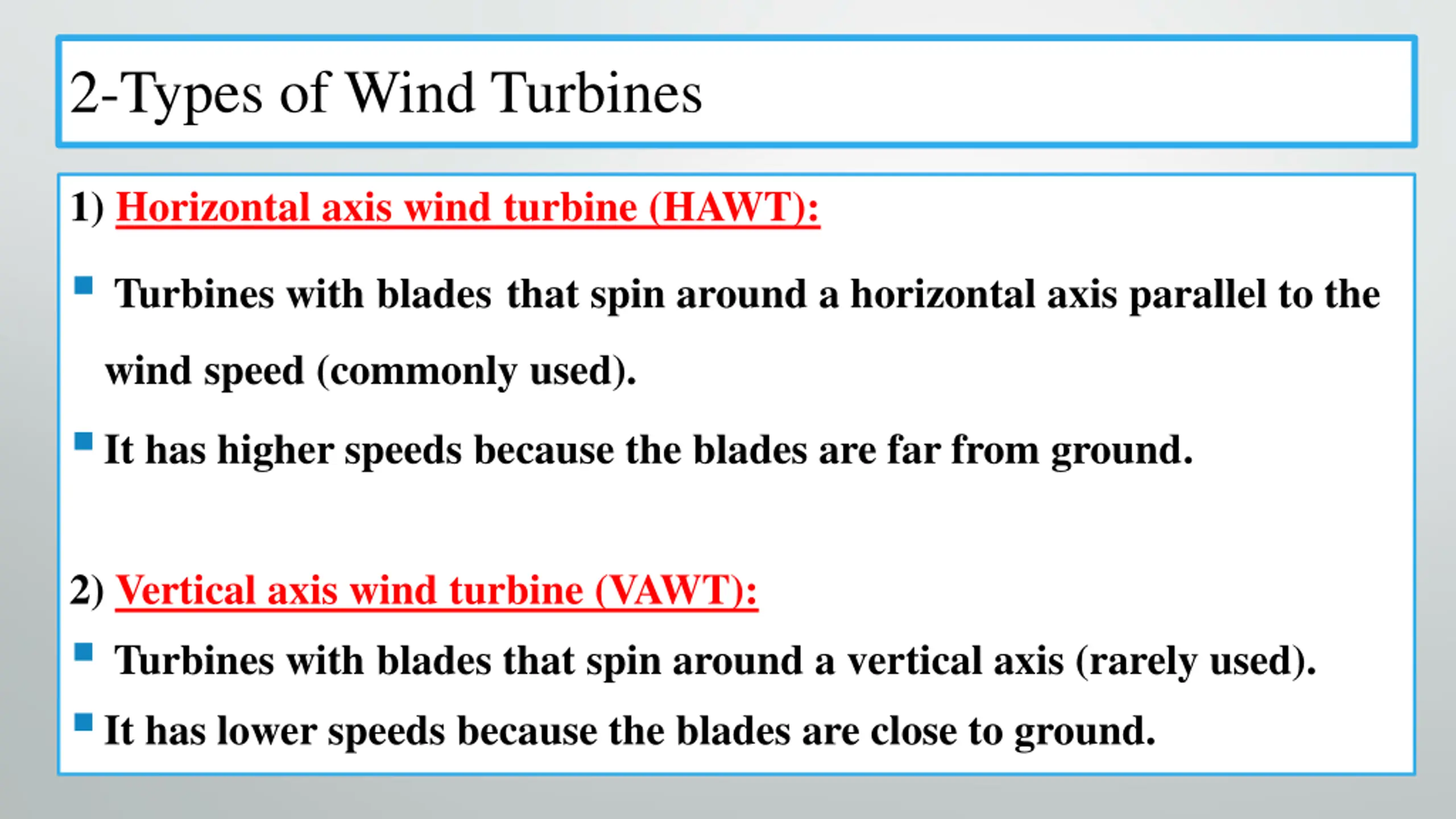 2-Types of Wind Turbines 1) Horizontal axis wind turbine (HAWT): Turbines with blades that spin around a horizontal axis parallel to the wind speed (commonly used). It has higher speeds because the blades are far from ground. 2) Vertical axis wind turbine (VAWT): Turbines with blades that spin around a vertical axis (rarely used). It has lower speeds because the blades are close to ground.