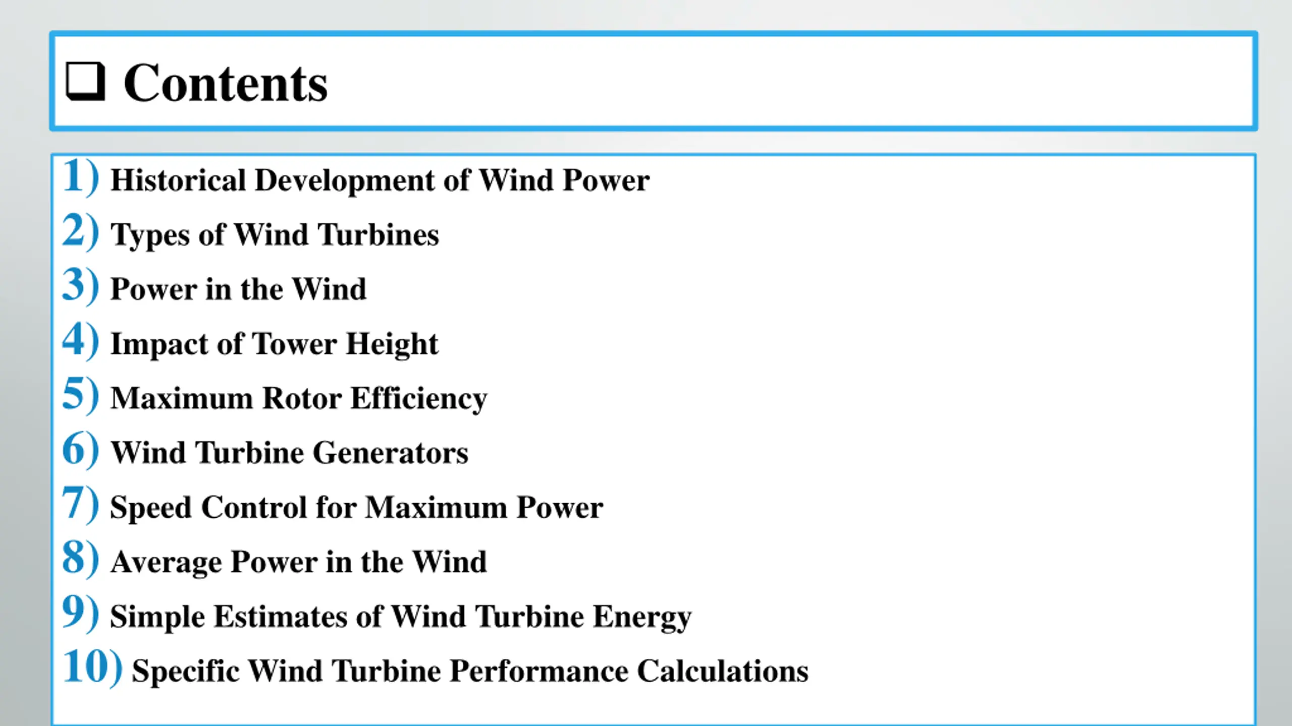 Contents 1) Historical Development of Wind Power 2) Types of Wind Turbines 3) Power in the Wind 4) Impact of Tower Height 5) Maximum Rotor Efficiency 6) Wind Turbine Generators 7) Speed Control for Maximum Power 8) Average Power in the Wind 9) Simple Estimates of Wind Turbine Energy 10) Specific Wind Turbine Performance Calculations