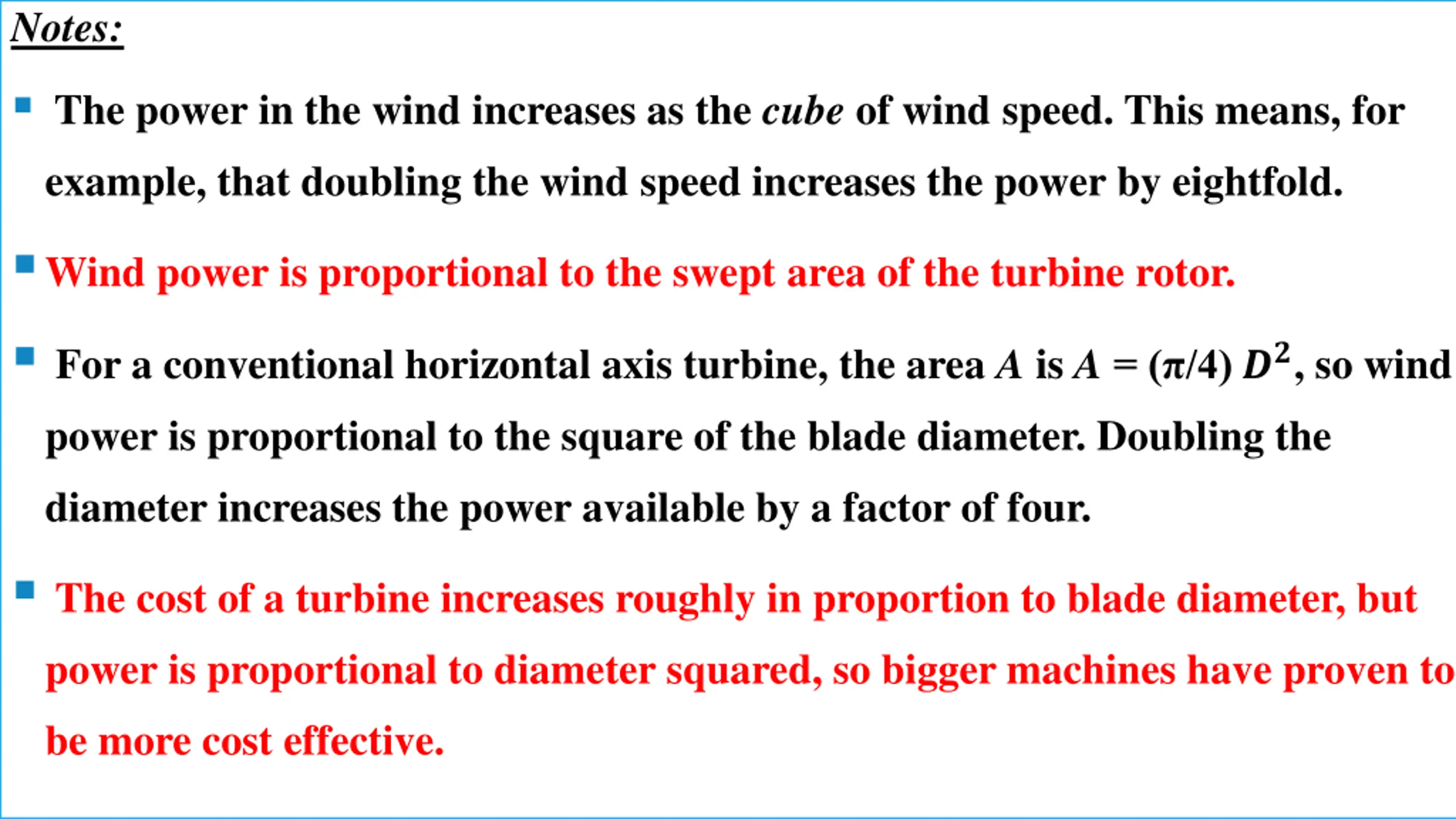 Notes: The power in the wind increases as the cube of wind speed. This means, for example, that doubling the wind speed increases the power by eightfold. Wind power is proportional to the swept area of the turbine rotor. For a conventional horizontal axis turbine, the area A is A= ( /4)??, so wind power is proportional to the square of the blade diameter. Doubling the diameter increases the power available by a factor of four. The cost of a turbine increases roughly in proportion to blade diameter, but power is proportional to diameter squared, so bigger machines have proven to be more cost effective.