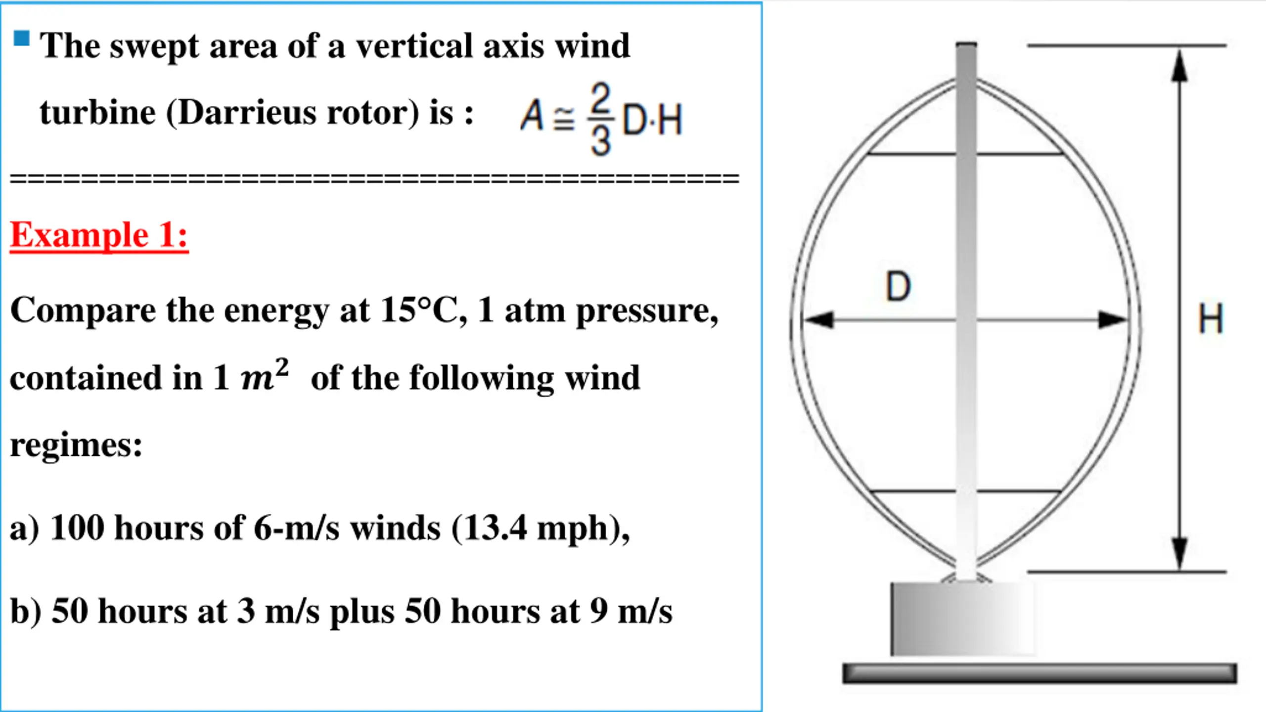The swept area of a vertical axis wind turbine (Darrieus rotor) is : ========================================= Example 1: Compare the energy at 15 C, 1 atm pressure, contained in 1 ?? of the following wind regimes: a) 100 hours of 6-m/s winds (13.4 mph), b) 50 hours at 3 m/s plus 50 hours at 9 m/s