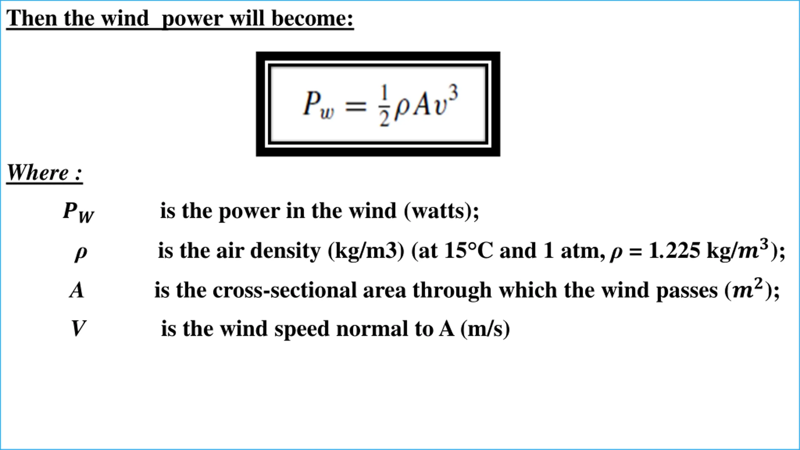 Then the wind power will become: Where : ?? is the power in the wind (watts); is the air density (kg/m3) (at 15 C and 1 atm, = 1.225 kg/??); A is the cross-sectional area through which the wind passes (??); V is the wind speed normal to A (m/s)