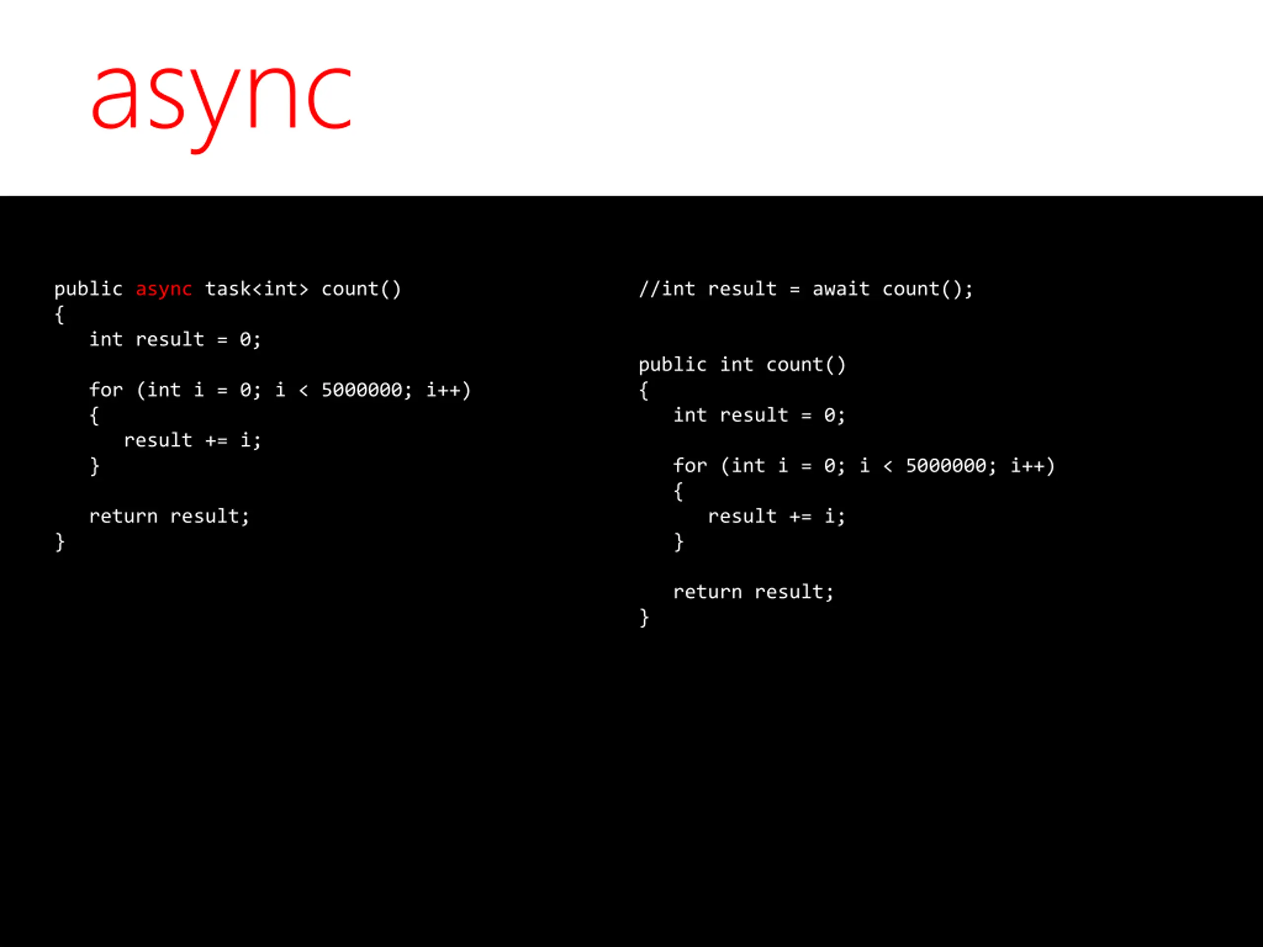 async public async task<int> count() { int result = 0; //int result = await count(); public int count() { int result = 0; for (int i = 0; i < 5000000; i++) { result += i; } for (int i = 0; i < 5000000; i++) { result += i; } return result; } return result; }